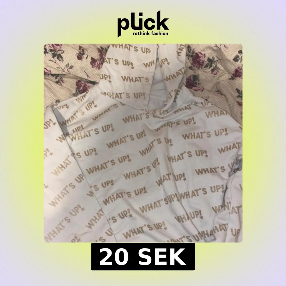 Vit hoodie med huva och all-over print i guldtext där det står 'WHAT'S UP!' över hela tröjan. Cool hoodie med guldiga bokstäver! Strl 158/164 alltså XS. Unisex tröja