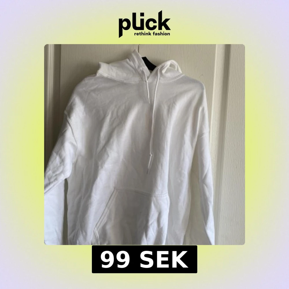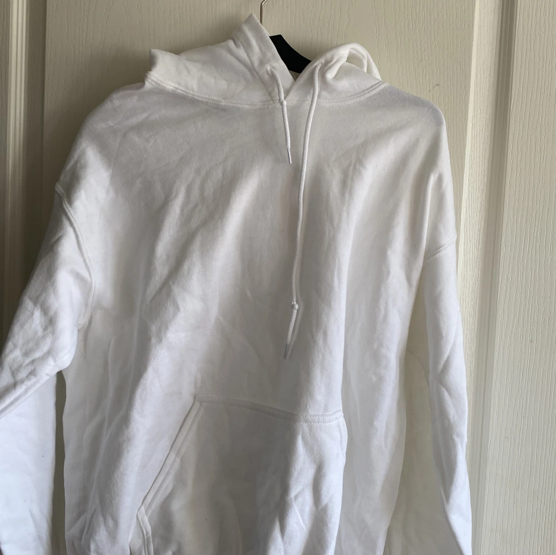 Klassisk vit hoodie med huva och snörning samt stor magficka framtill. Tröjan har lång ärm och är tillverkad i mjuk bomull, perfekt för en avslappnad och stilren look.