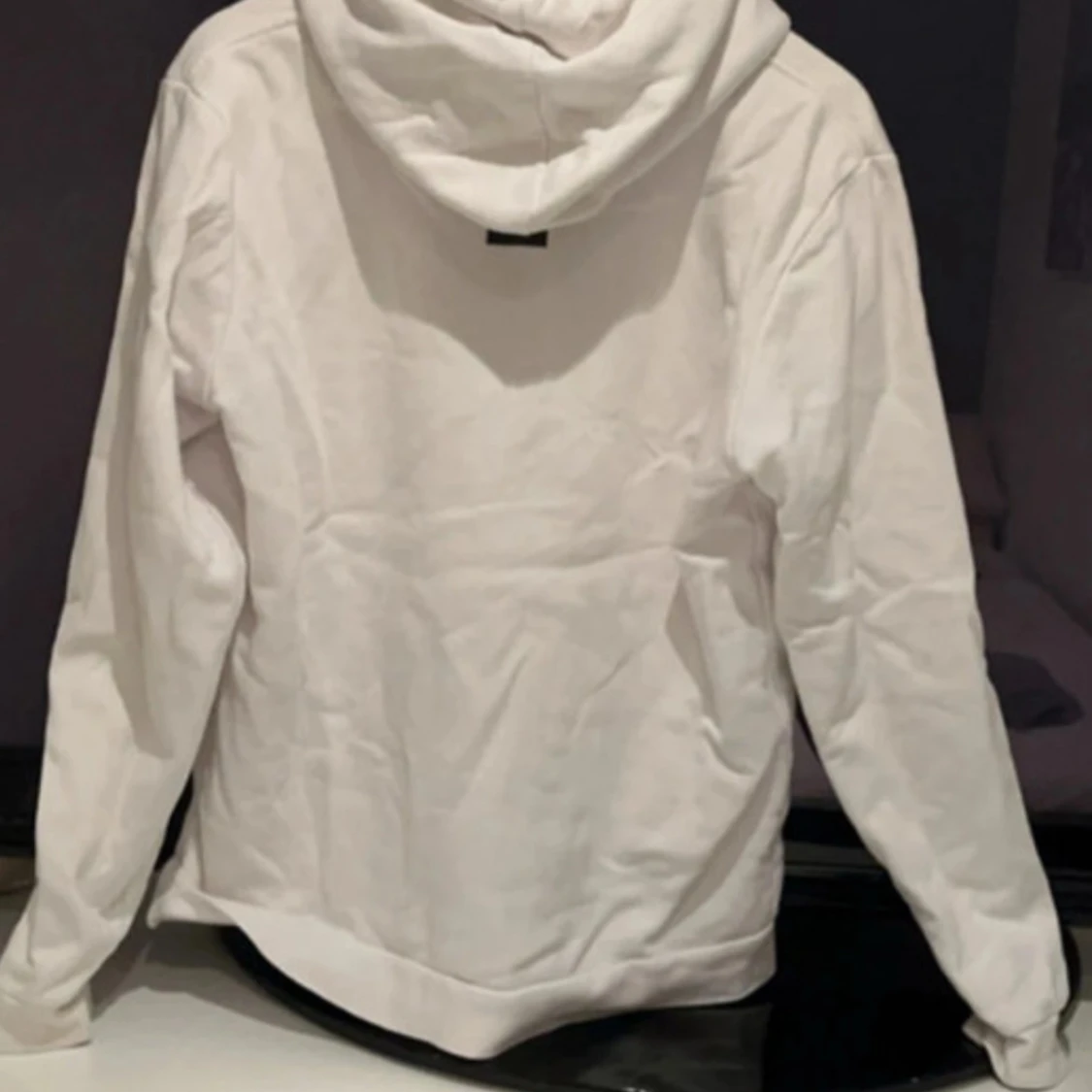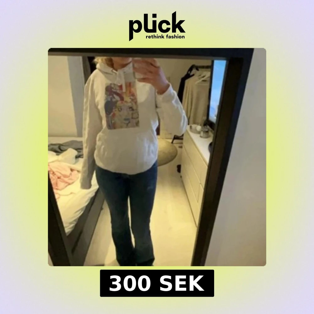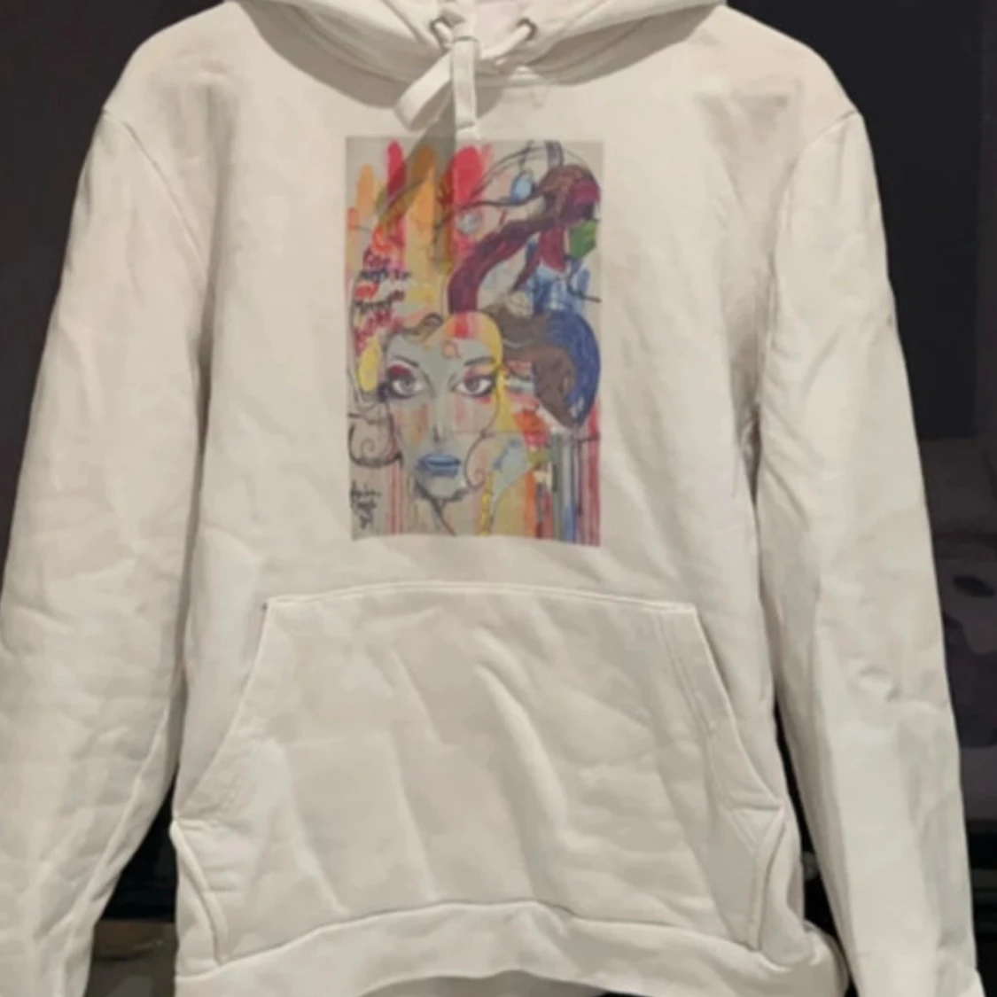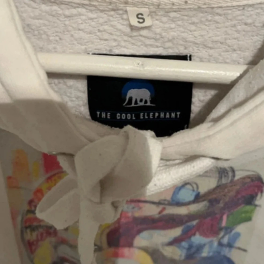 Säljer en vit hoodie från The Cool Elephant i storlek S. Tröjan har ett färgstarkt konsttryck med ansikte och abstrakta detaljer på bröstet, snörning vid huvan och en klassisk magficka. Perfekt för dig som gillar unika och kreativa plagg.