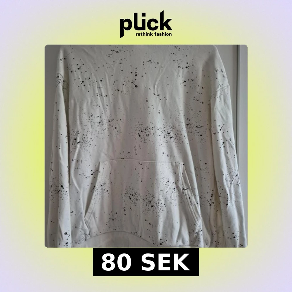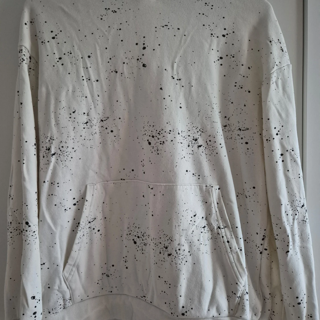Säljer en cool vit hoodie med svart stänkmönster. Den har en klassisk känguruficka framtill och långa ärmar. Perfekt för en avslappnad stil.
