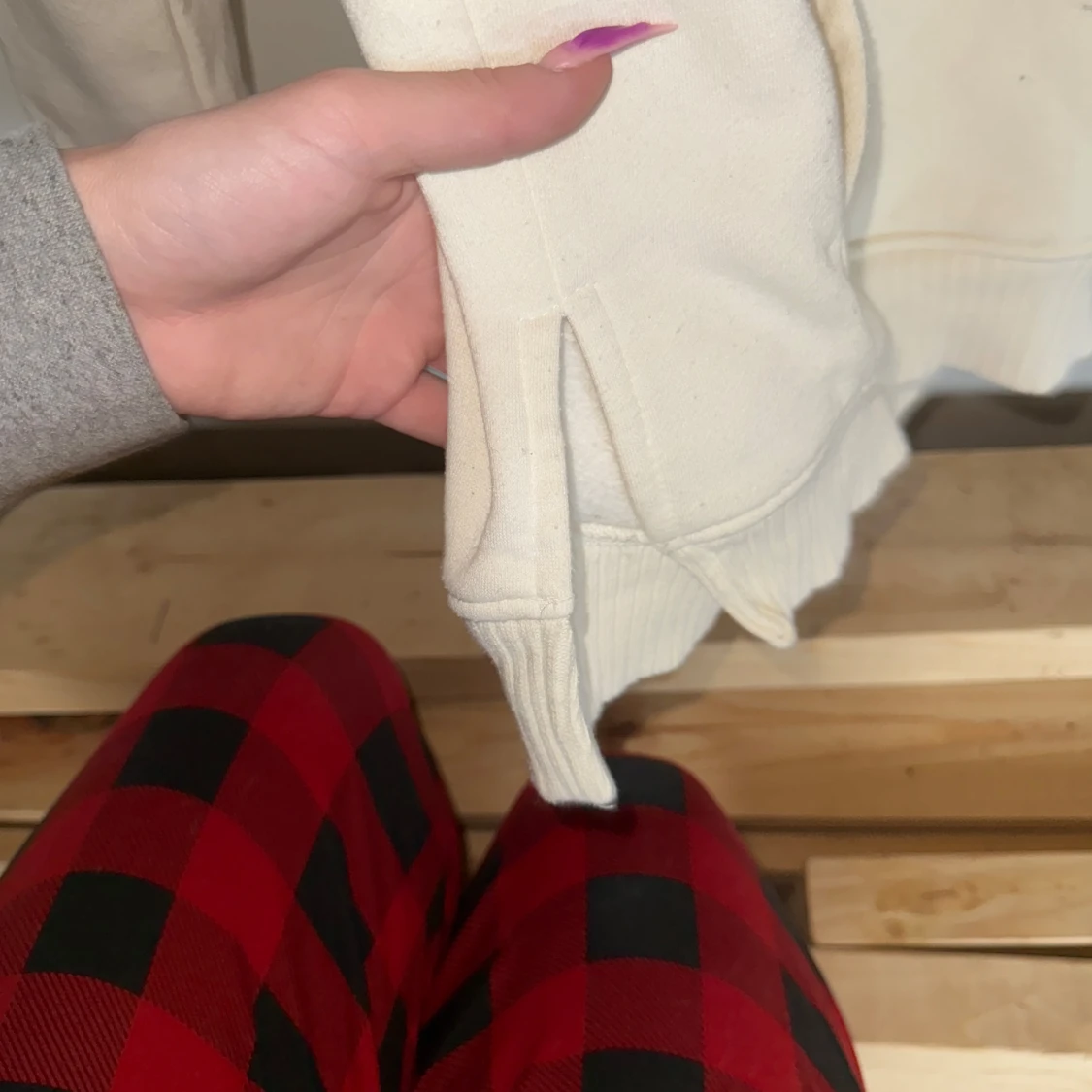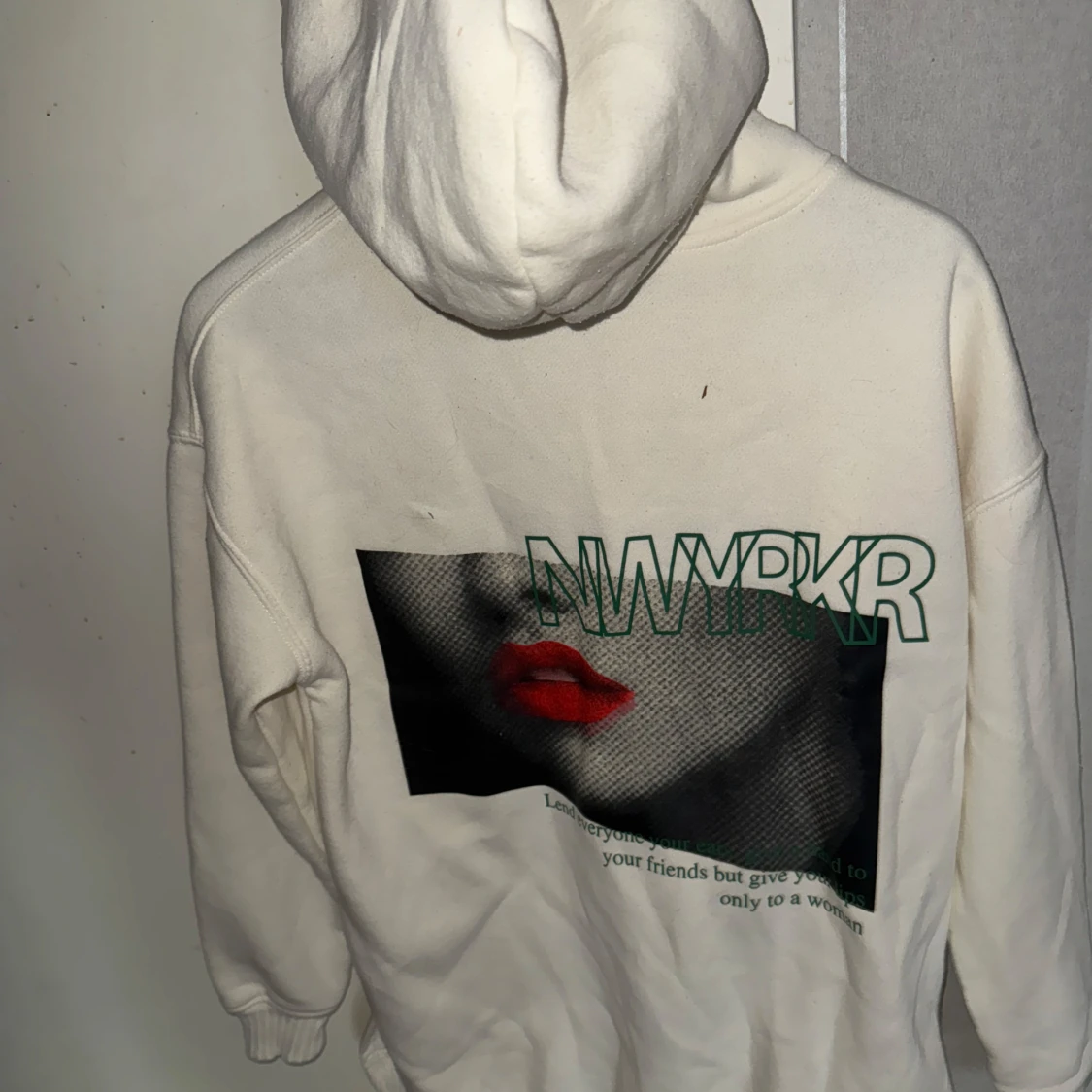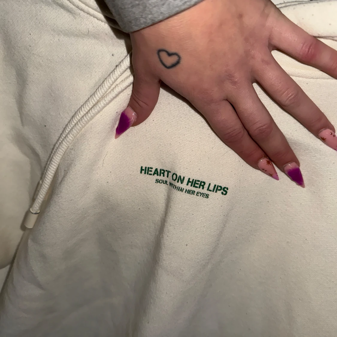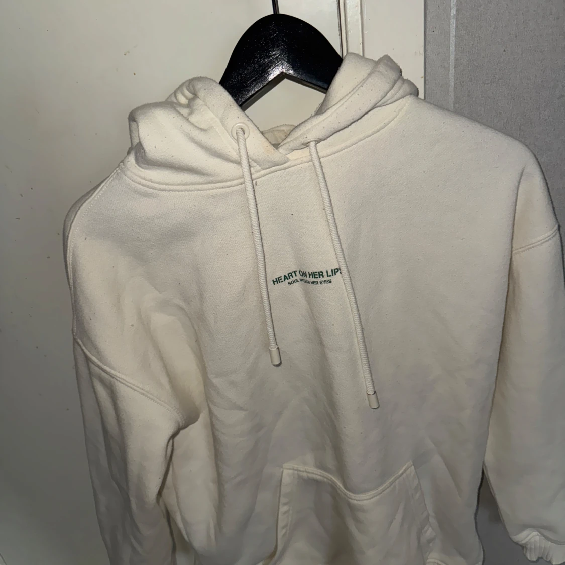 Säljer en vit hoodie med texten 'HEART ON HER LIPS' tryckt på framsidan och ett stort grafiskt tryck på baksidan. Hoodien har en klassisk passform med långa ärmar och en rymlig huva. Perfekt för en avslappnad stil.