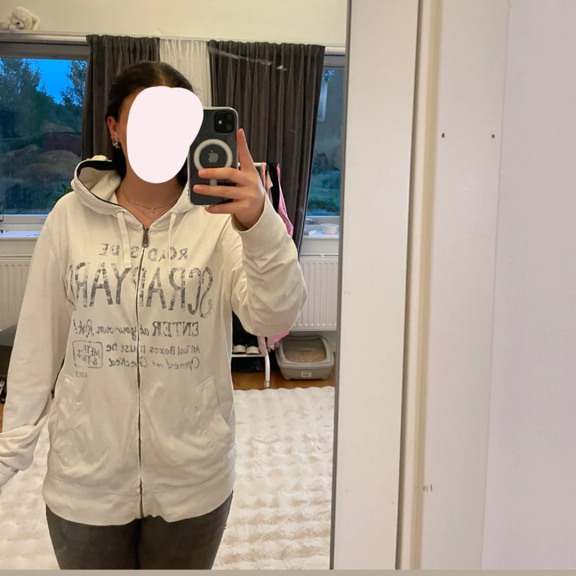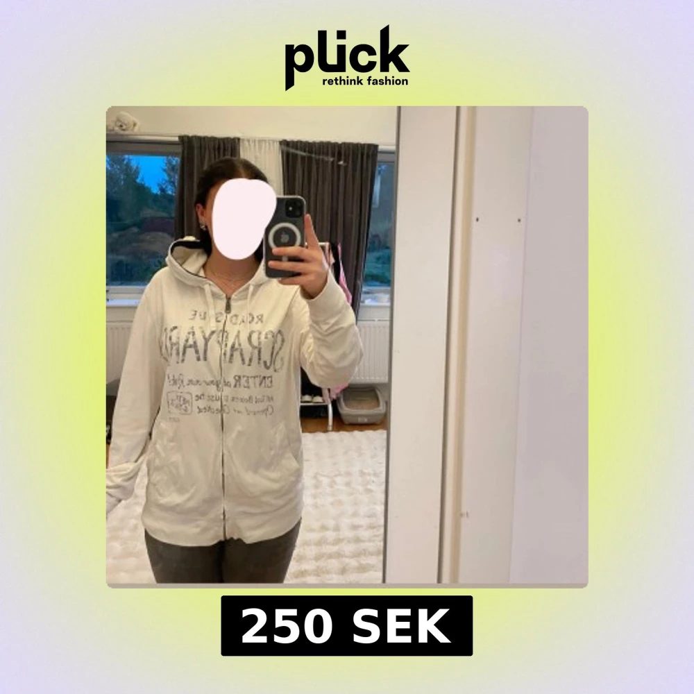 Vit hoodie med dragkedja och huva från SORAYAN. Något fläckig vid armarna som knappt syns, går att få bild vid intresse💗