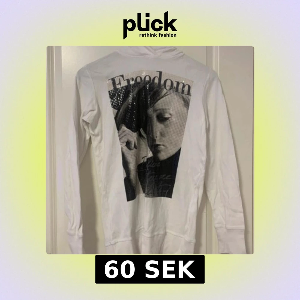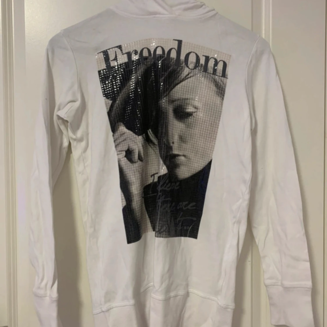 Vit hoodie med stort svartvitt tryck och texten 'Freedom' på ryggen. Trycket har paljett-detaljer som ger en glittrig effekt. Tröjan har långa ärmar och huva