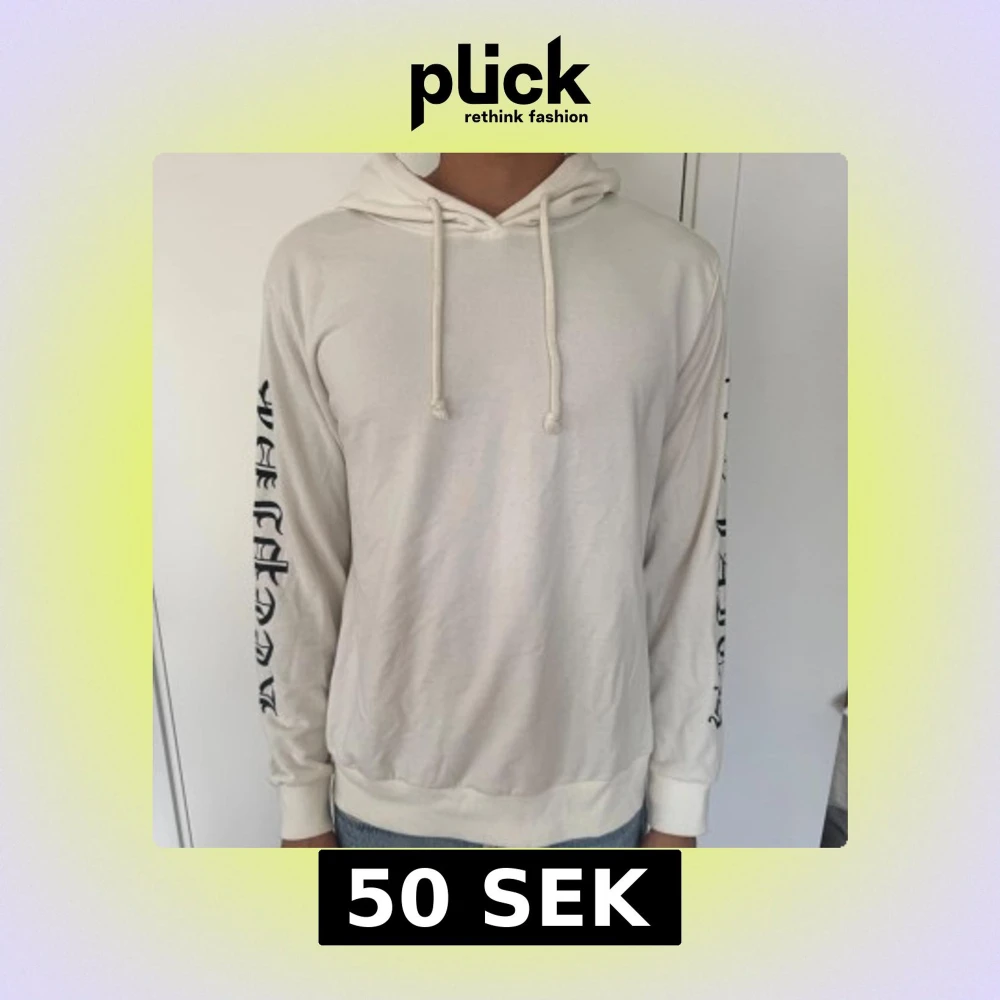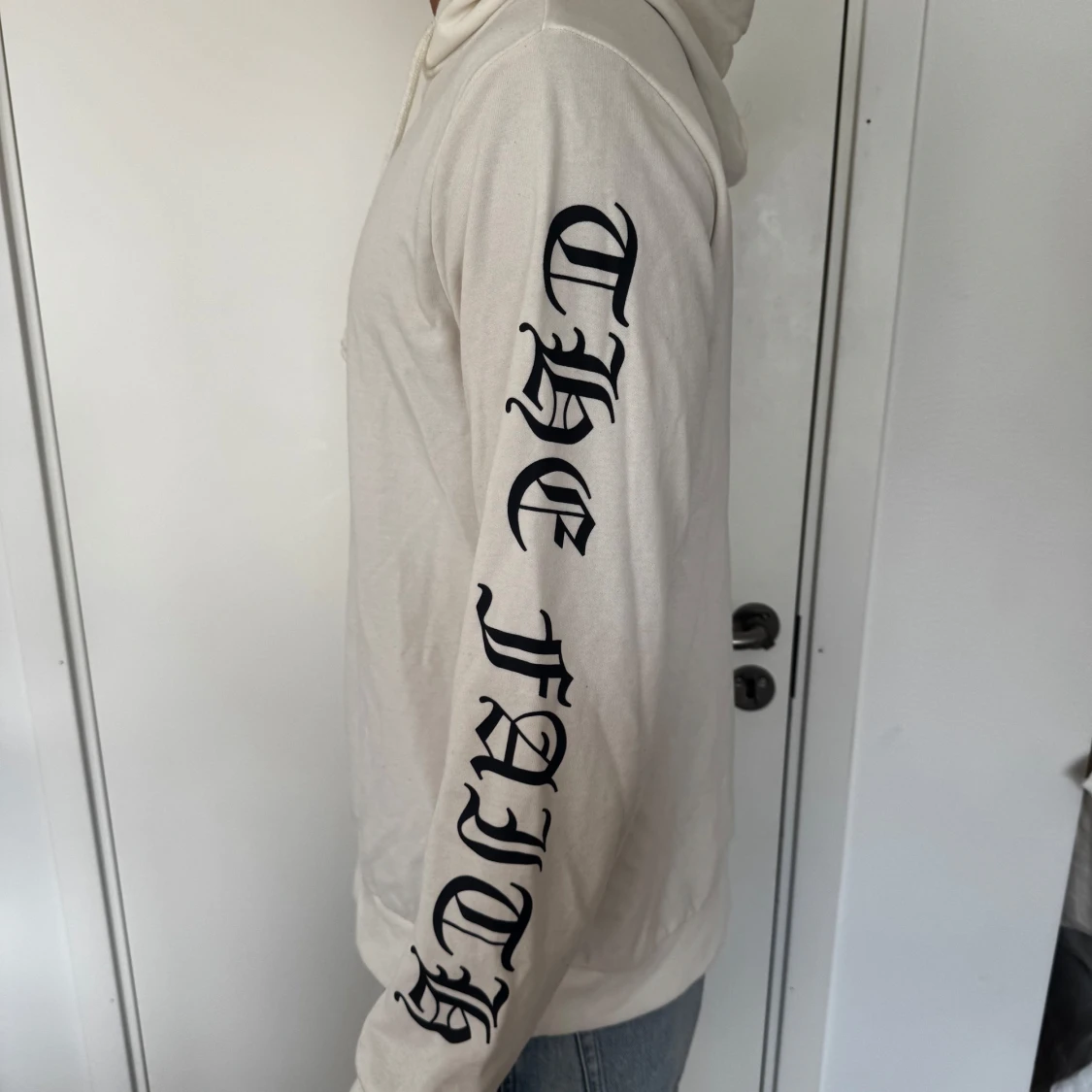 Säljer en vit hoodie med huva och snörning. Tröjan har svart tryck i gotisk stil längs båda ärmarna. Mjuk och skön, perfekt för en chill look. Passar dig som gillar streetwear och enkel stil.