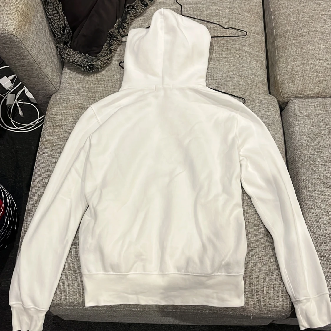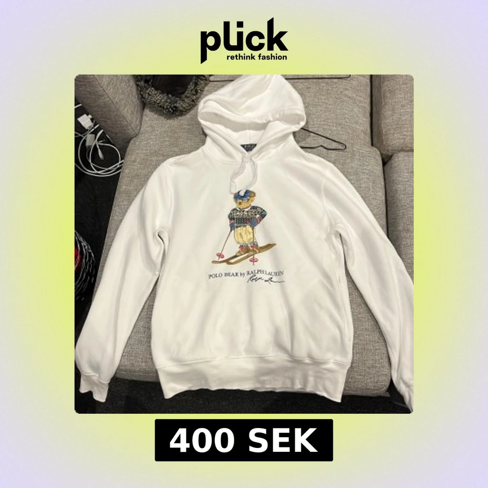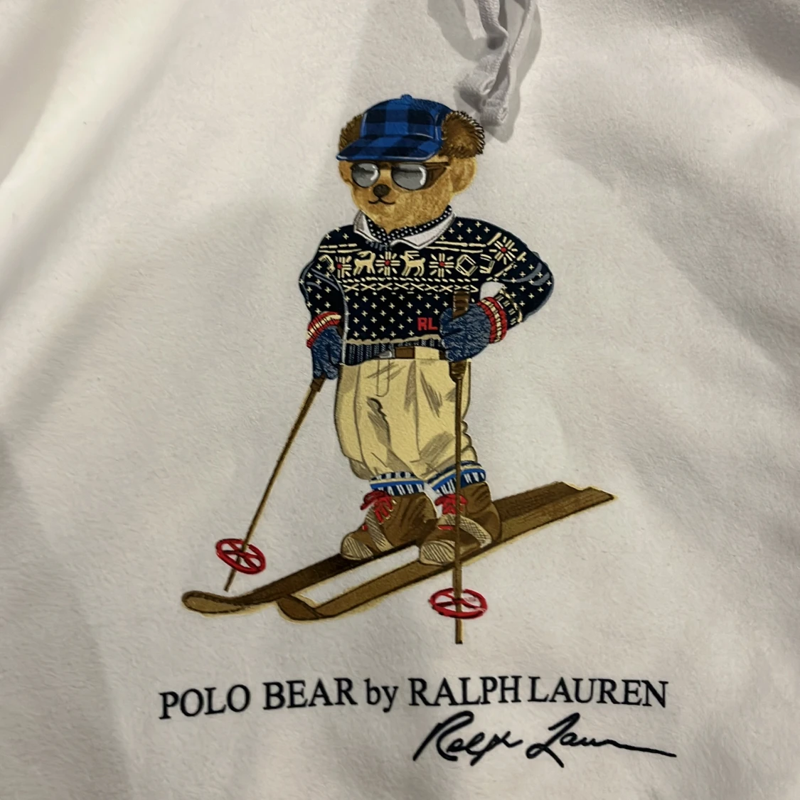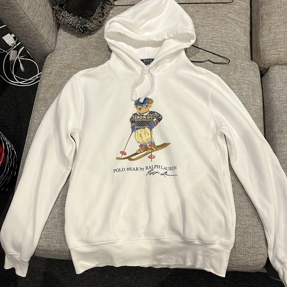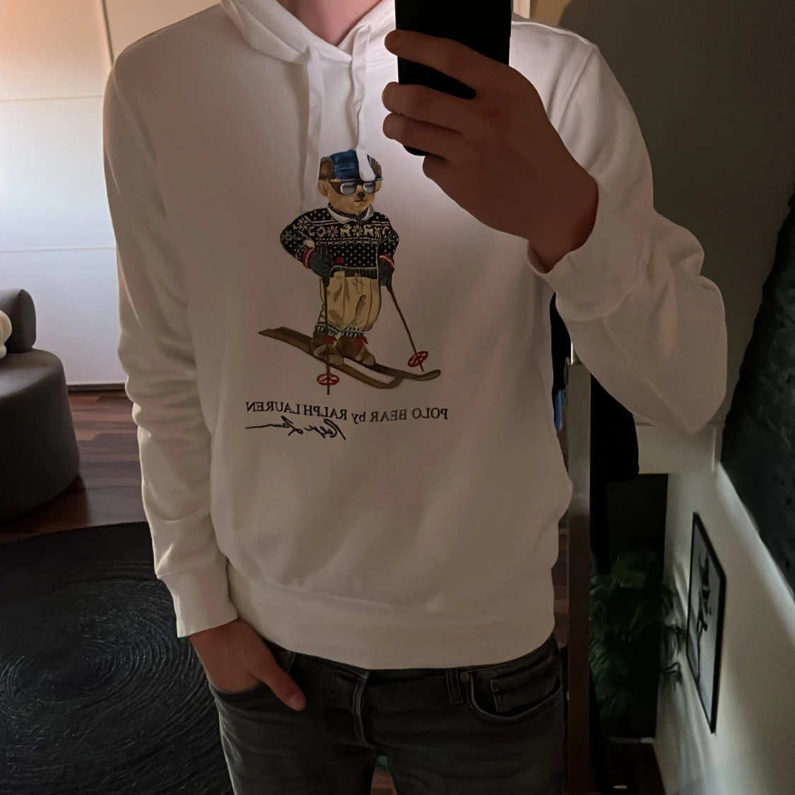 Vit hoodie från Polo Ralph Lauren med ikoniskt Polo Bear-tryck där björnen står på skidor i vinteroutfit. Tröjan har huva med snörning och långärmade muddar. Mjuk insida i bomullsmix, perfekt för chill dagar och cool stil.