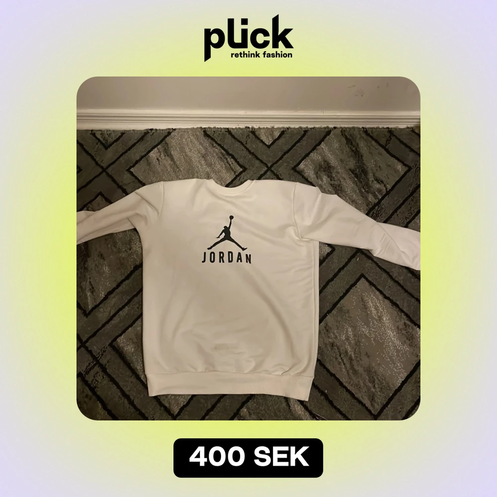 Säljer en snygg vit Jordan sweatshirt med det klassiska Jumpman-logotypen på både fram- och baksidan. Tröjan har långa ärmar och är perfekt för en casual look. Den är i bra skick och passar perfekt för höst och vår.storlek S priset kan diskuteras vid snabb äffar