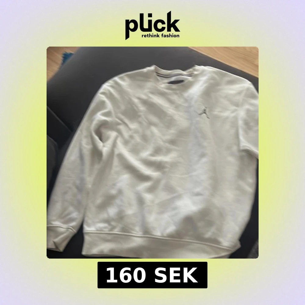 Säljer en clean vit Jordan sweatshirt i bomull med klassisk crewneck och stor JORDAN-tryck på ryggen. Liten Jumpman-logga på bröstet. Perfekt för dig som gillar sportig och avslappnad stil. Långärmad och mjuk insida.