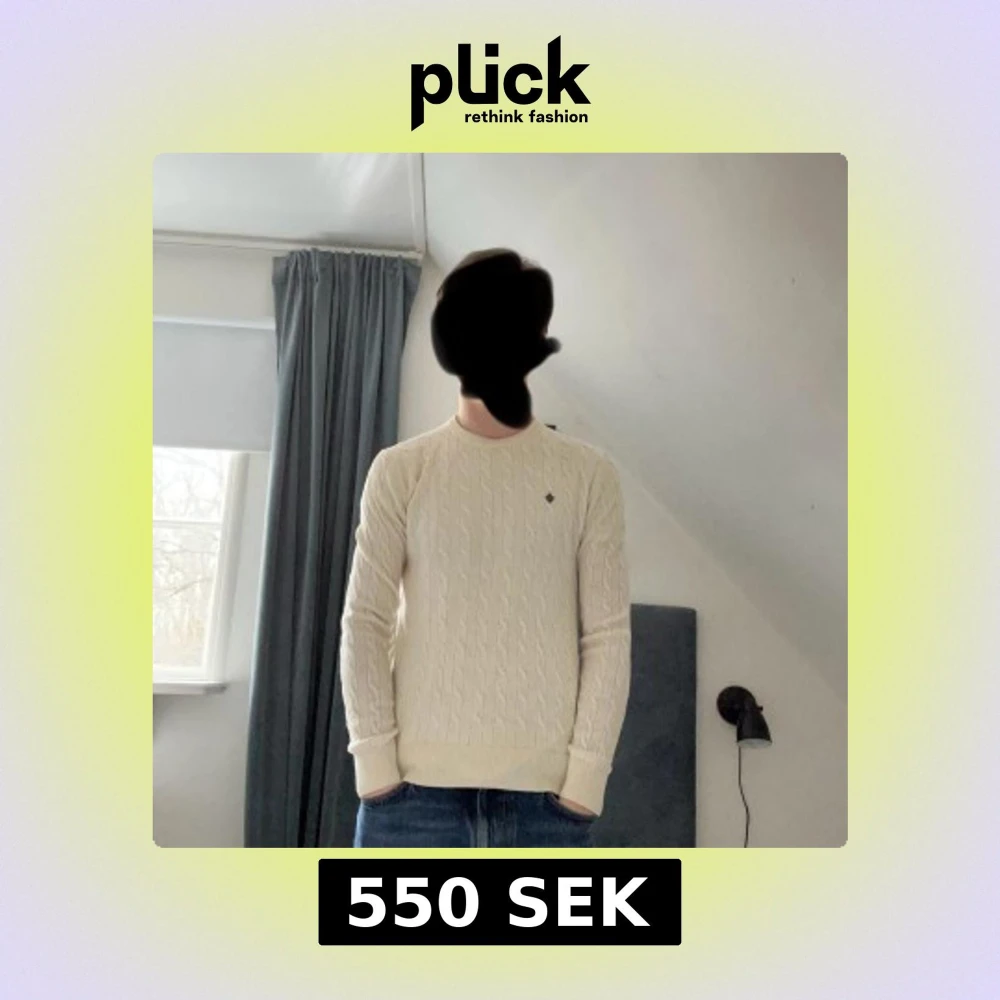 Säljer en stilren vit stickad tröja från Morris med en liten diskret logga på bröstet. Tröjan har ett klassiskt flätmönster och långa ärmar.