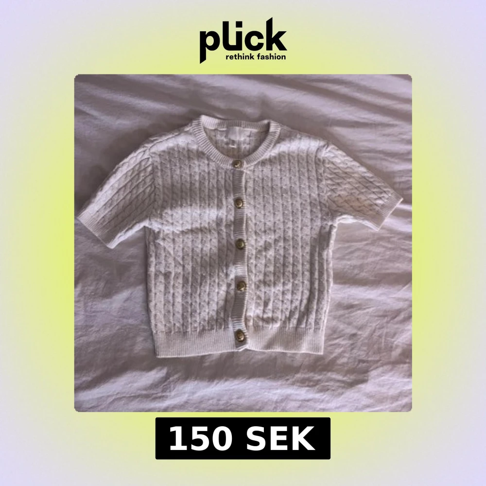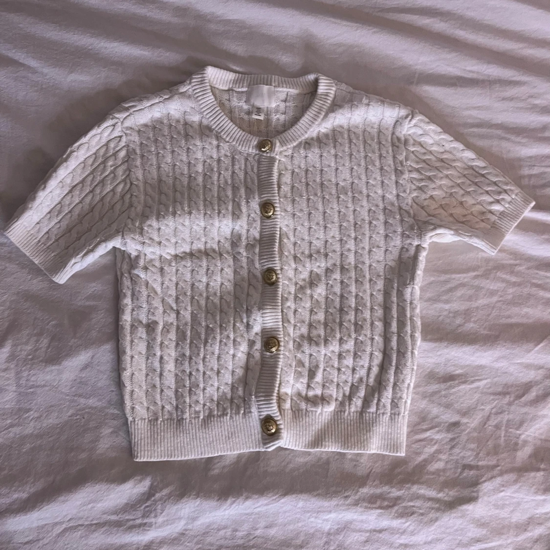 Supersöt vit kabelstickad kofta med korta ärmar och snygga guldfärgade knappar framtill. Perfekt till vår och sommar, lätt att matcha med både jeans och kjol. Ribbstickade kanter ger en extra touch. En riktig garderobsfavorit!