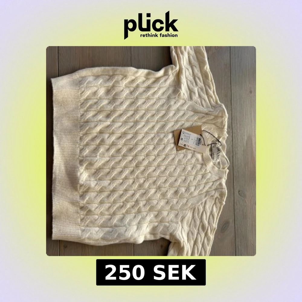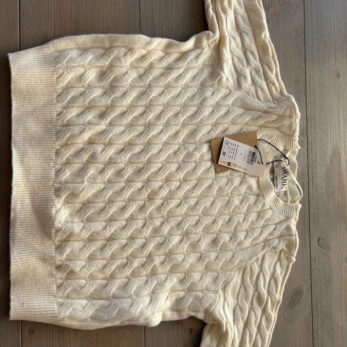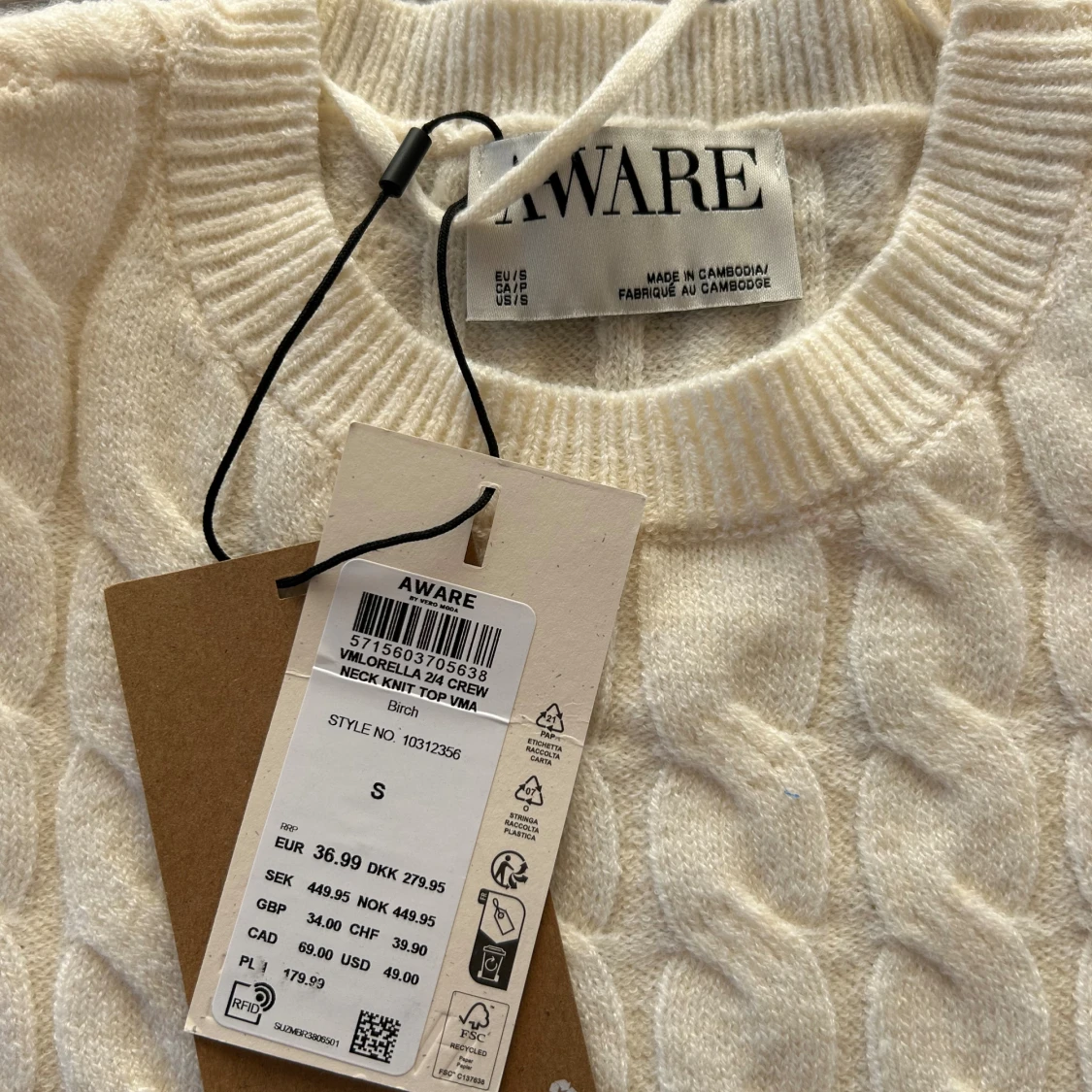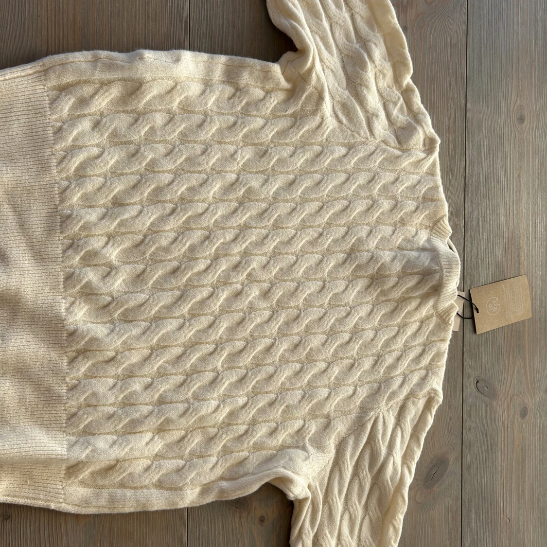 Kabelstickad tröja i mjuk vit nyans från Aware. Tröjan har rund halsringning, ribbade muddar och ett klassiskt flätmönster över hela plagget. Perfekt för lager-på-lager och en clean look till jeans eller kjol.