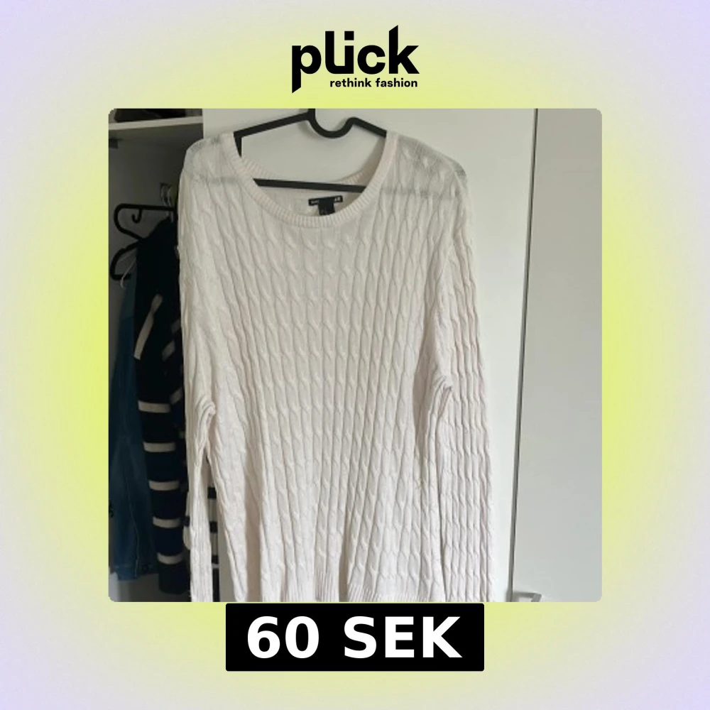 Säljer en vit kabelstickad tröja från H&M med rund halsringning och långa ärmar. Tröjan har ribbade muddar vid ärmslut och nederkant samt en liten slits i sidan. Perfekt för lager-på-lager och enkel att matcha.