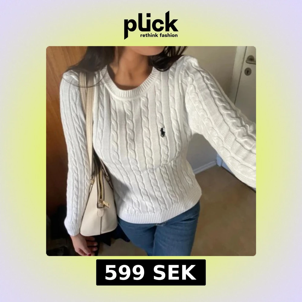 Säljer en stilren vit kabelstickad tröja från Ralph Lauren med deras ikoniska logga på bröstet. Tröjan har en rund halsringning och långa ärmar, perfekt för en klassisk look. Passar bra till jeans eller kjol för en avslappnad men elegant stil.