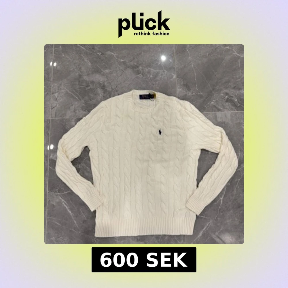 Säljer en vit kabelstickad tröja från Polo Ralph Lauren i storlek M. Tröjan har rund hals, ribbade muddar och det klassiska broderade Polo-logot på bröstet. Perfekt för dig som gillar clean och stilren look med premiumkänsla.