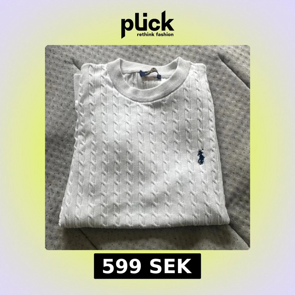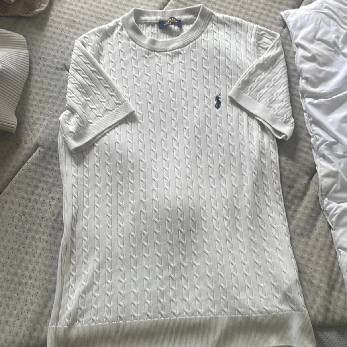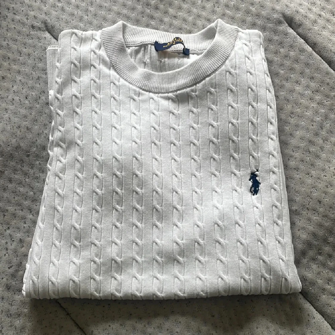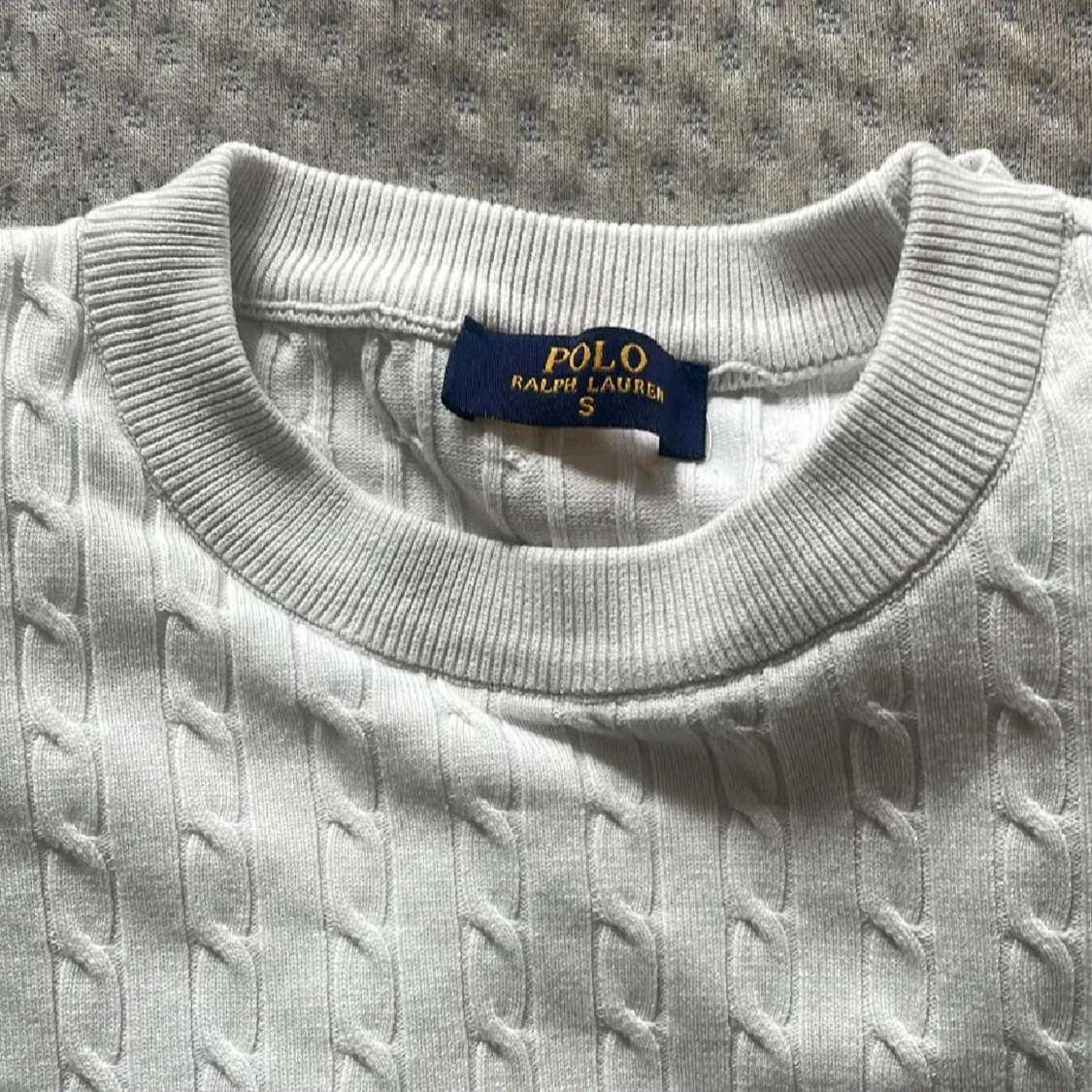 Vit kabelstickad tröja från Polo Ralph Lauren med korta ärmar och rund hals. Klassisk design med broderad marinblå logga på bröstet. Tröjan är i bomull och har ribbade muddar vid hals, ärmslut och nederkant. Perfekt för en clean och stilren look. Passar även M