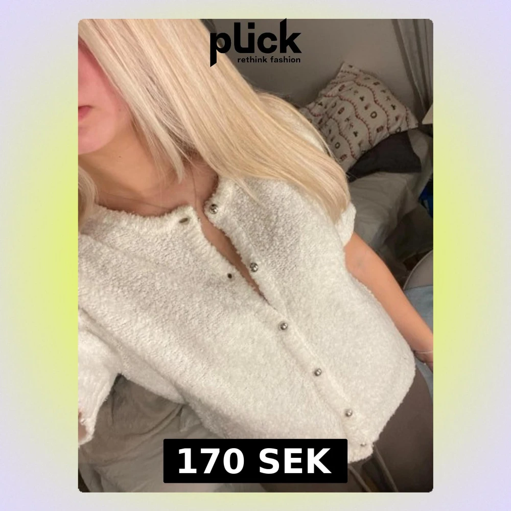 Mysig vit kofta från Gina Tricot i storlek M passar S. Koftan har korta ärmar, rund hals och är gjord i ett fluffigt stickat material. Den stängs med silvriga knappar framtill.