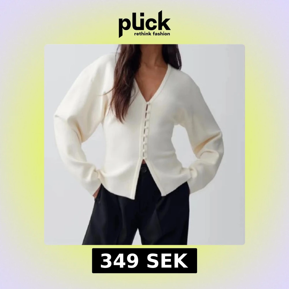 Säljer en stilren vit kofta med v-ringning och knappar framtill. Koftan har långa ärmar och en ribbad struktur som ger en elegant touch. Passar perfekt till en gullig jeanskjol!💓💓