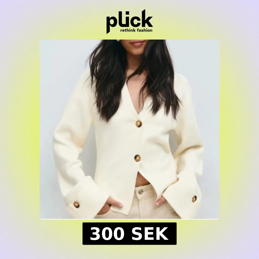 Snygg beige kofta med v-ringning och stora bruna knappar framtill och vid ärmsluten. Koftan har långärmade, lite vidare ärmar