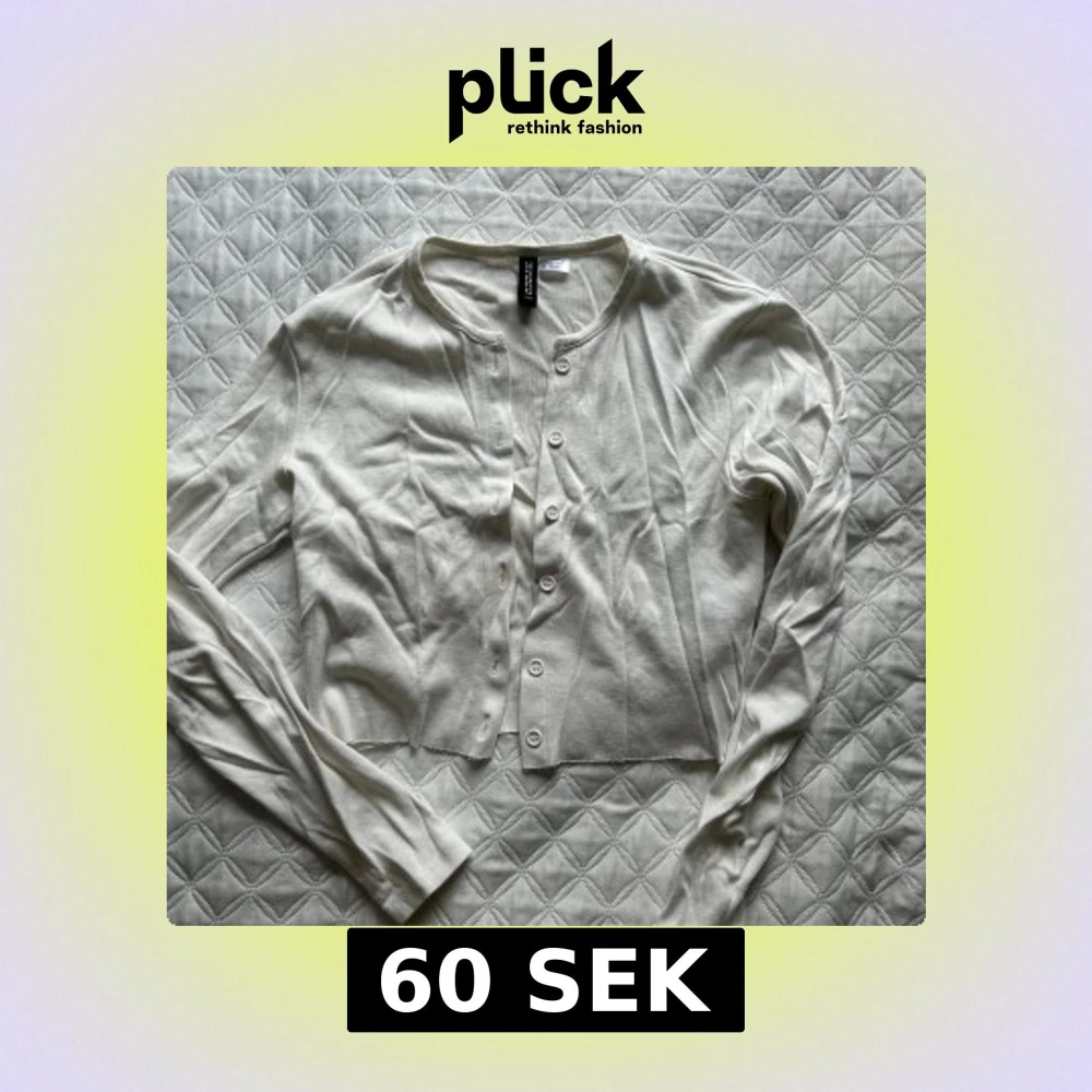 Säljer en stilren vit kofta från H&M med knappar framtill. Den har långa ärmar och en rund halsringning. Perfekt för lager-på-lager-stil eller som ett lättare ytterplagg.