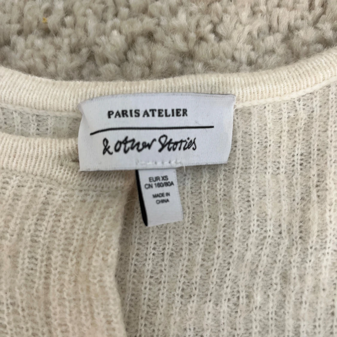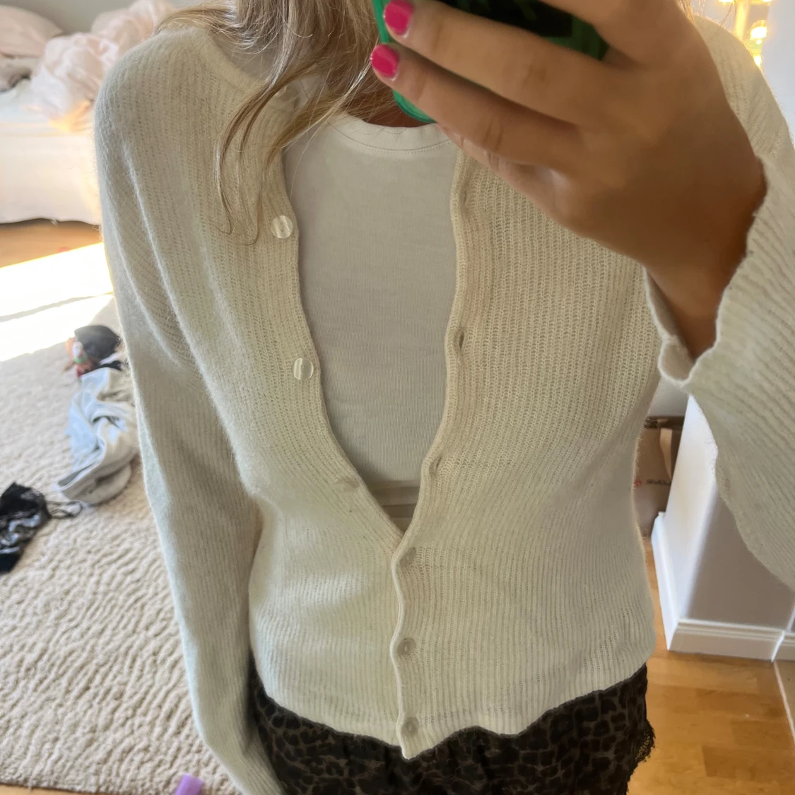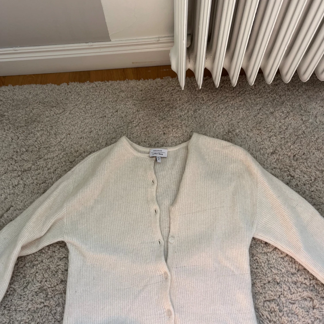 Superfin vit kofta från & Other Stories i storlek XS. Koftan är stickad med en mjuk känsla, har långa ärmar och knäpps med knappar framtill. Den är väl använd så man ser att plagget är använt