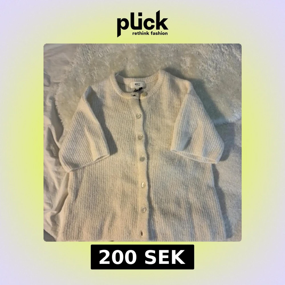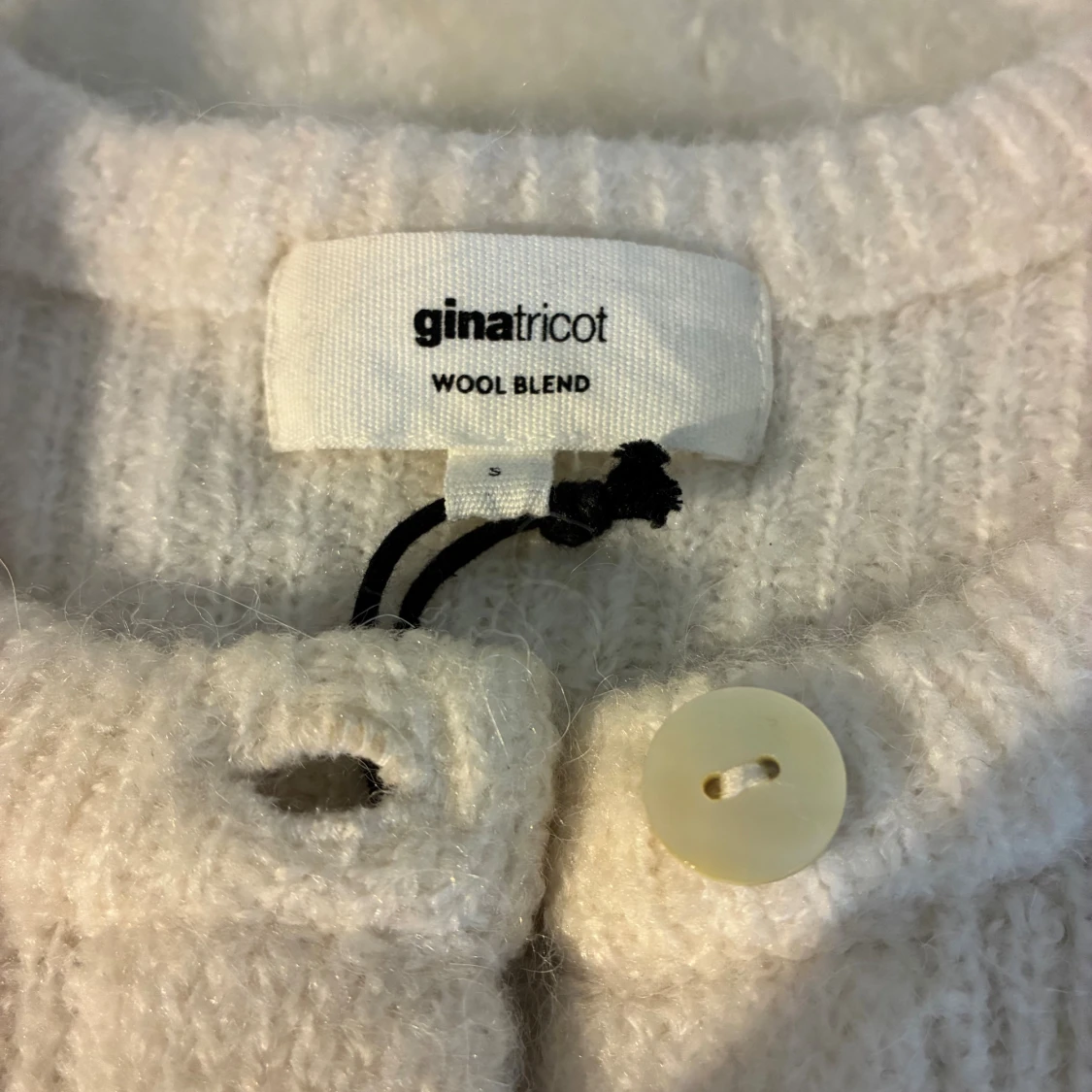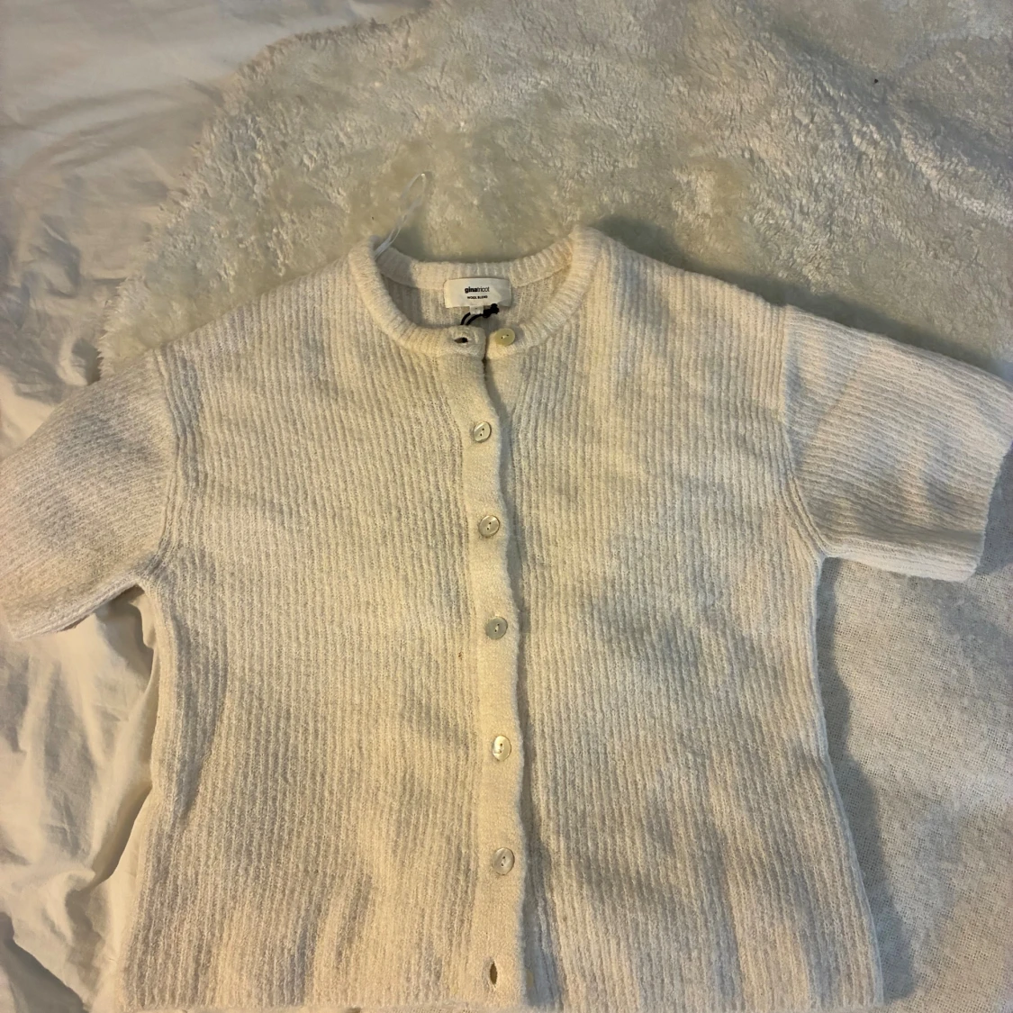 Supermysig vit kofta från Gina Tricot i ullblandning. Den har korta ärmar, rund hals och knäpps med knappar framtill. Ribbstickad struktur ger en stilren och enkel look, perfekt att slänga över en topp när det är kyligt.