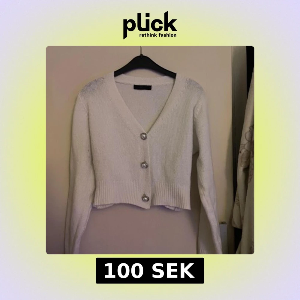 Superfin vit stickad kofta med v-ringning och tre dekorativa pärlknappar framtill. Modellen är croppad och har långa ärmar samt bred ribbad mudd nedtill och vid ärmslut. Perfekt att slänga över en topp för en söt look.