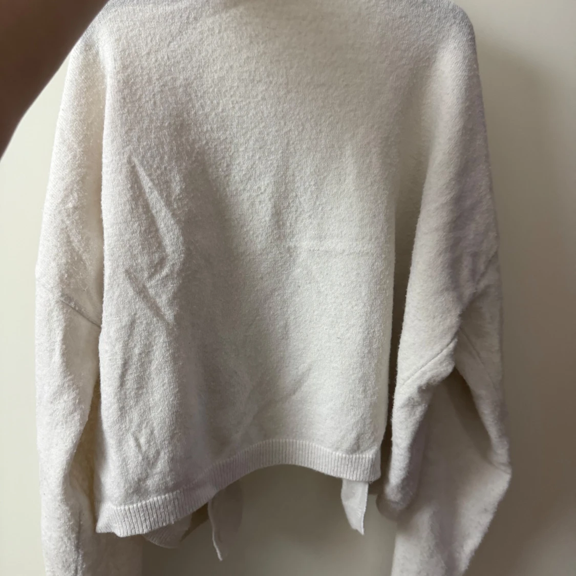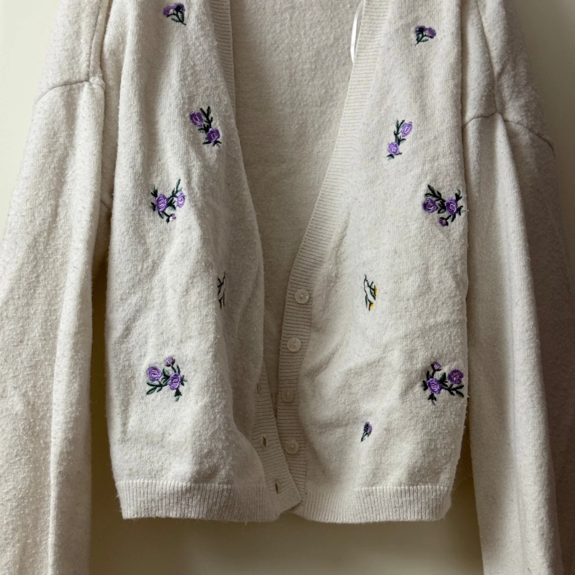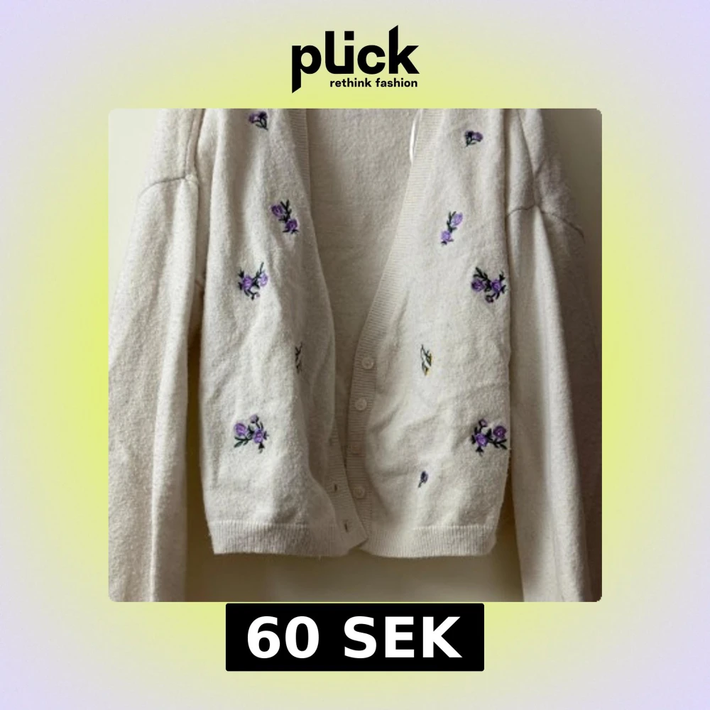 Superfin vit kofta från bikbok med lila broderade blommor och knappar framtill. Koftan har lång ärm, ribbade muddar och en mjuk, stickad känsla. Perfekt för dig som gillar en söt och mysig stil med unika detaljer. Storlek S men passar M också