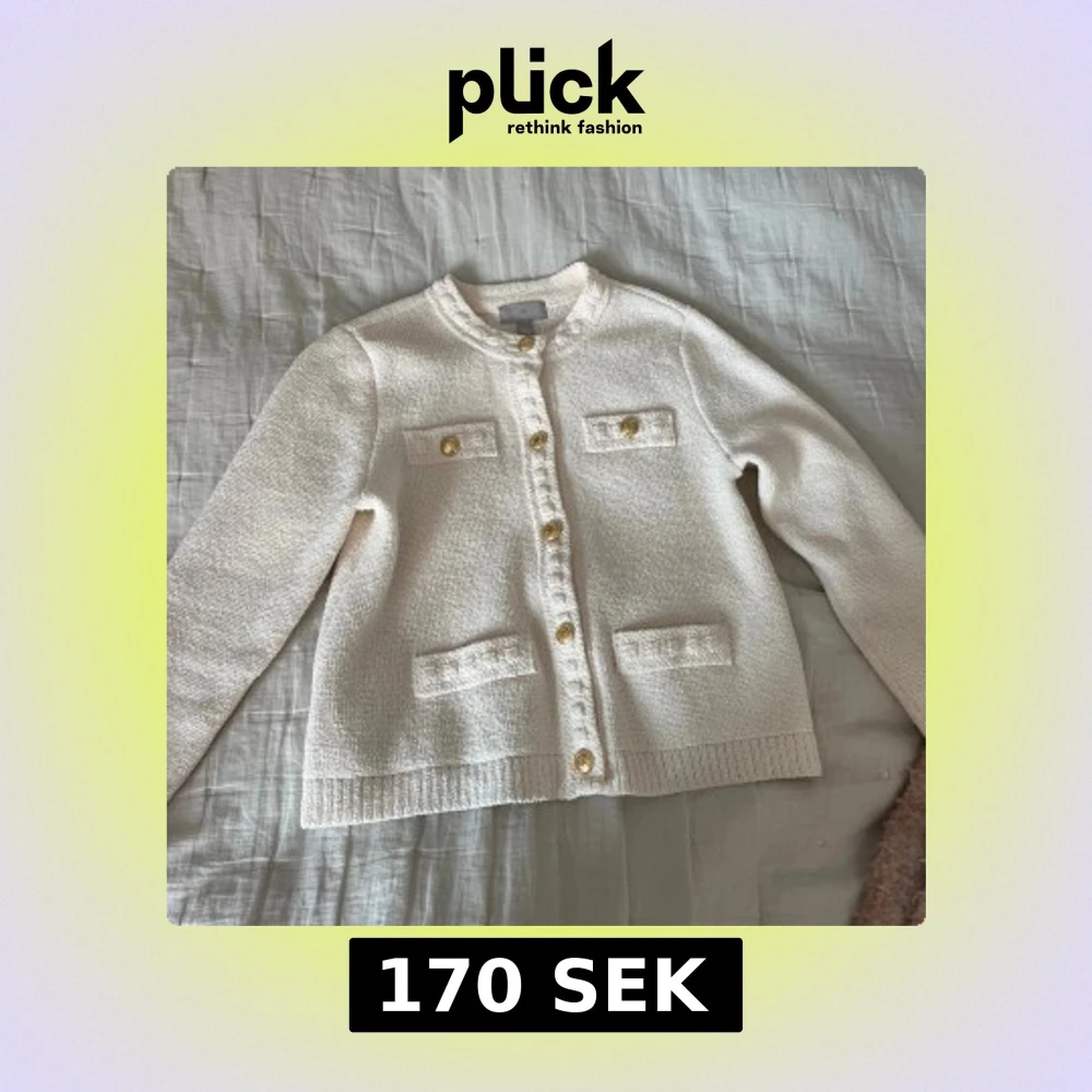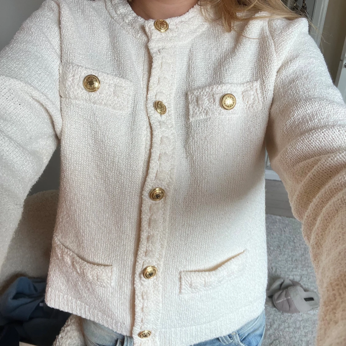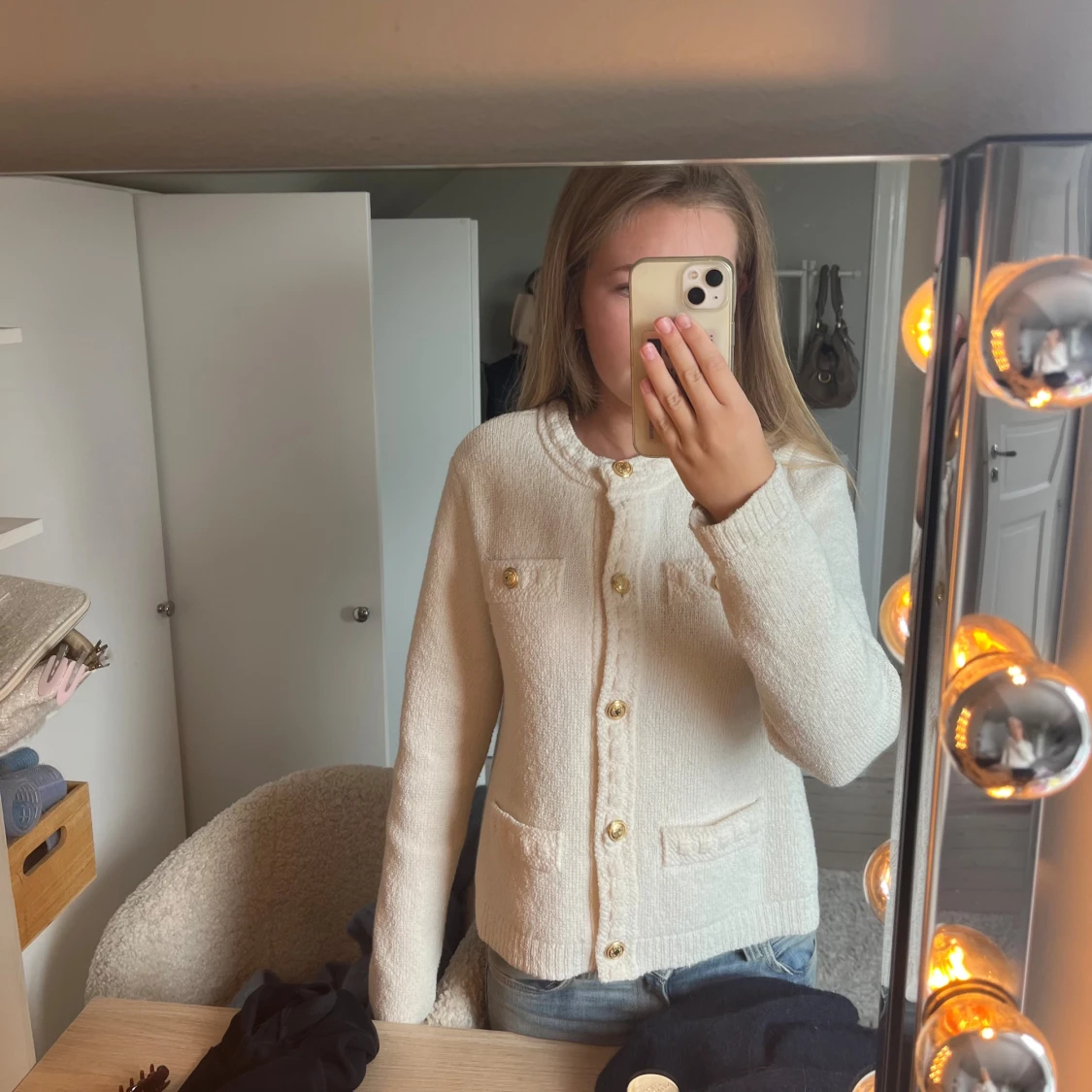Säljer en stilren vit kofta från H&M med snygga guldknappar framtill och dekorativa fickor. Koftan har rund halsringning, lång ärm och är tillverkad i ett mjukt, stickat material. Perfekt för att lyfta din outfit med en klassisk touch.