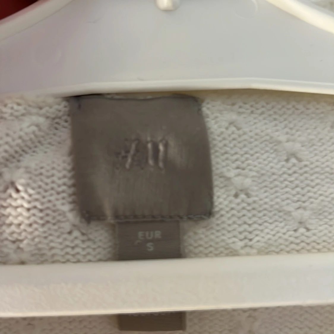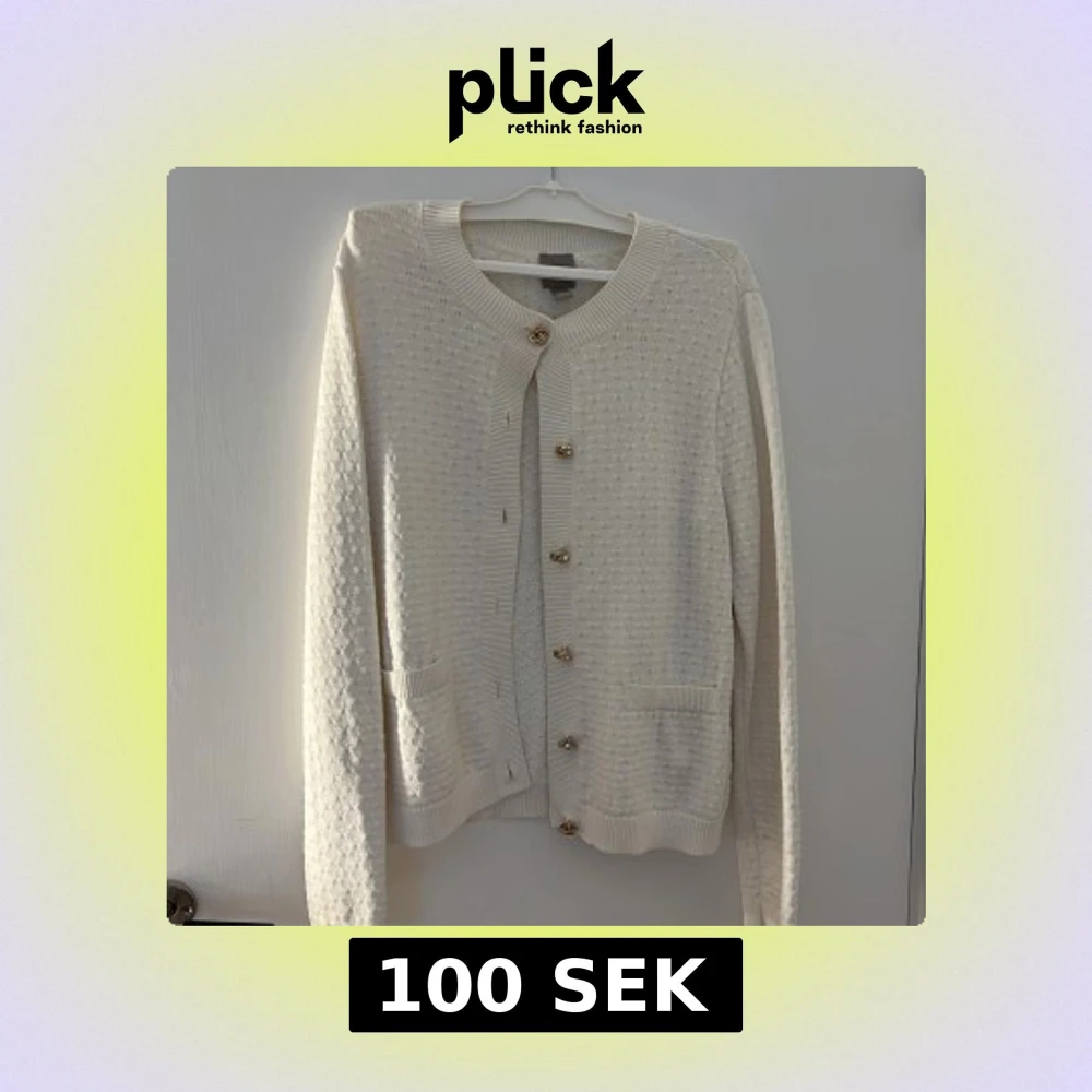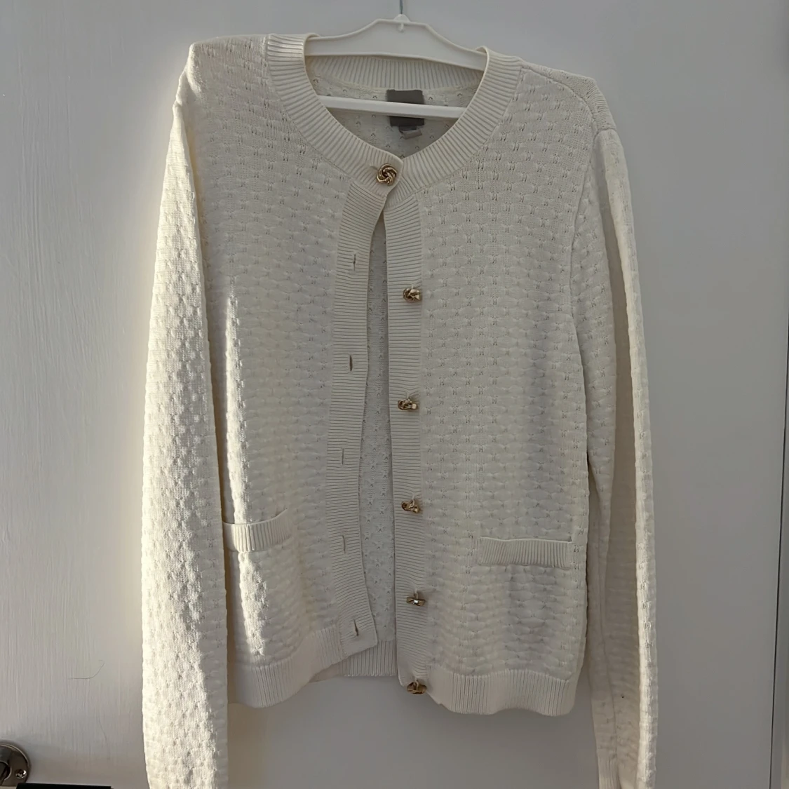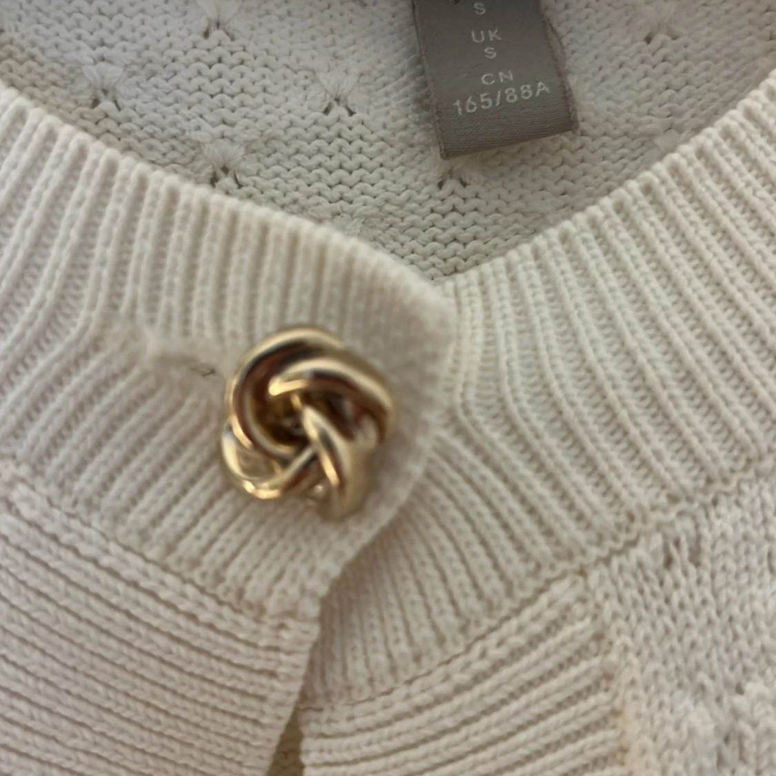 Säljer en stilren vit kofta från H&M i storlek S. Koftan är stickad med diskret struktur, har två fickor framtill och snygga guldiga knappar. Perfekt att slänga över en t-shirt eller klänning för en clean look.
