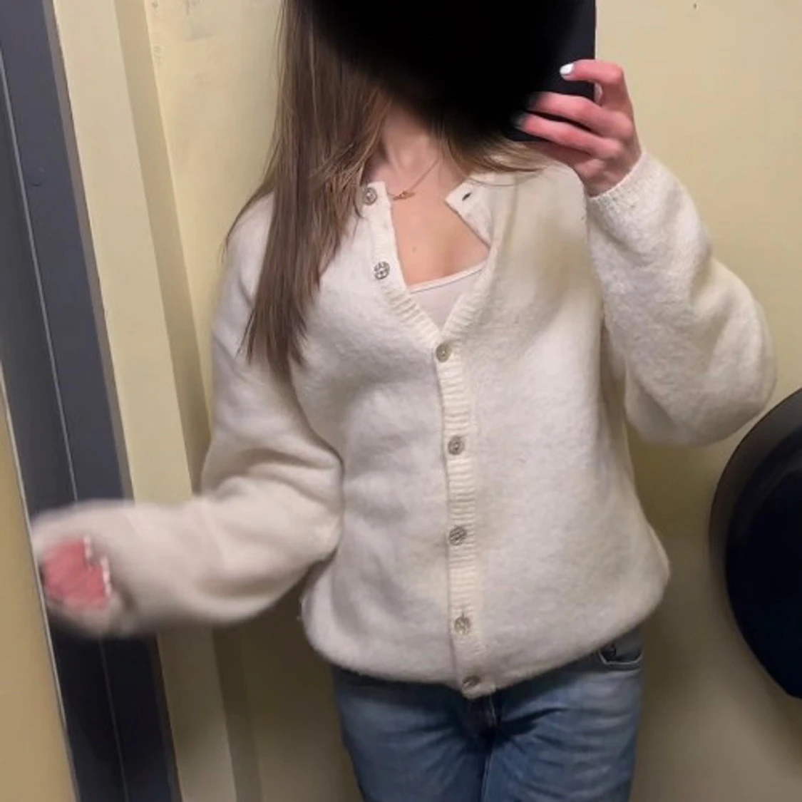 Mysig vit kofta med v-ringning och stora knappar framtill. Koftan har en lite oversized passform och är stickad i ett fluffigt material. Perfekt att slänga över en topp och matcha med jeans för en chill look.