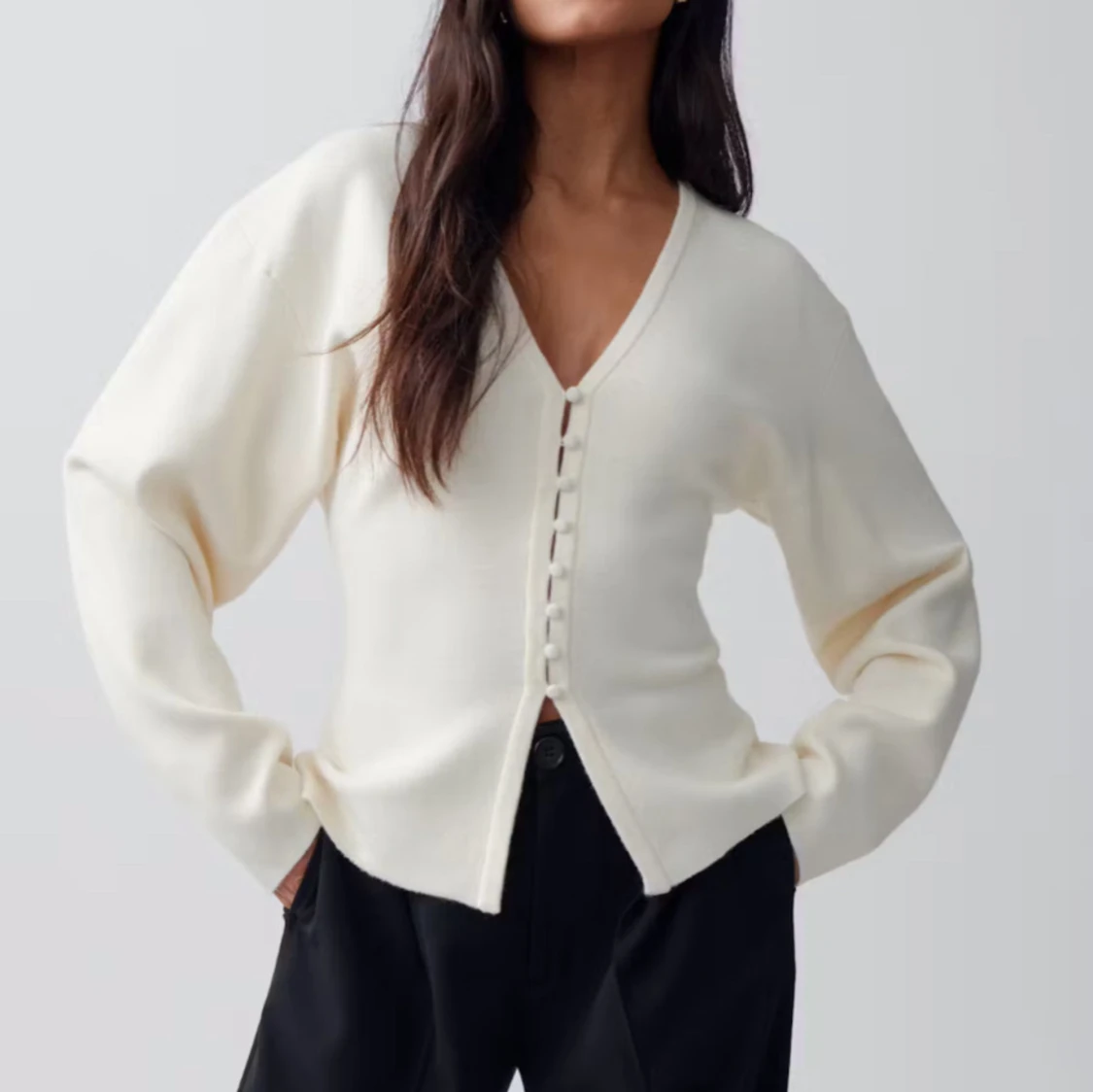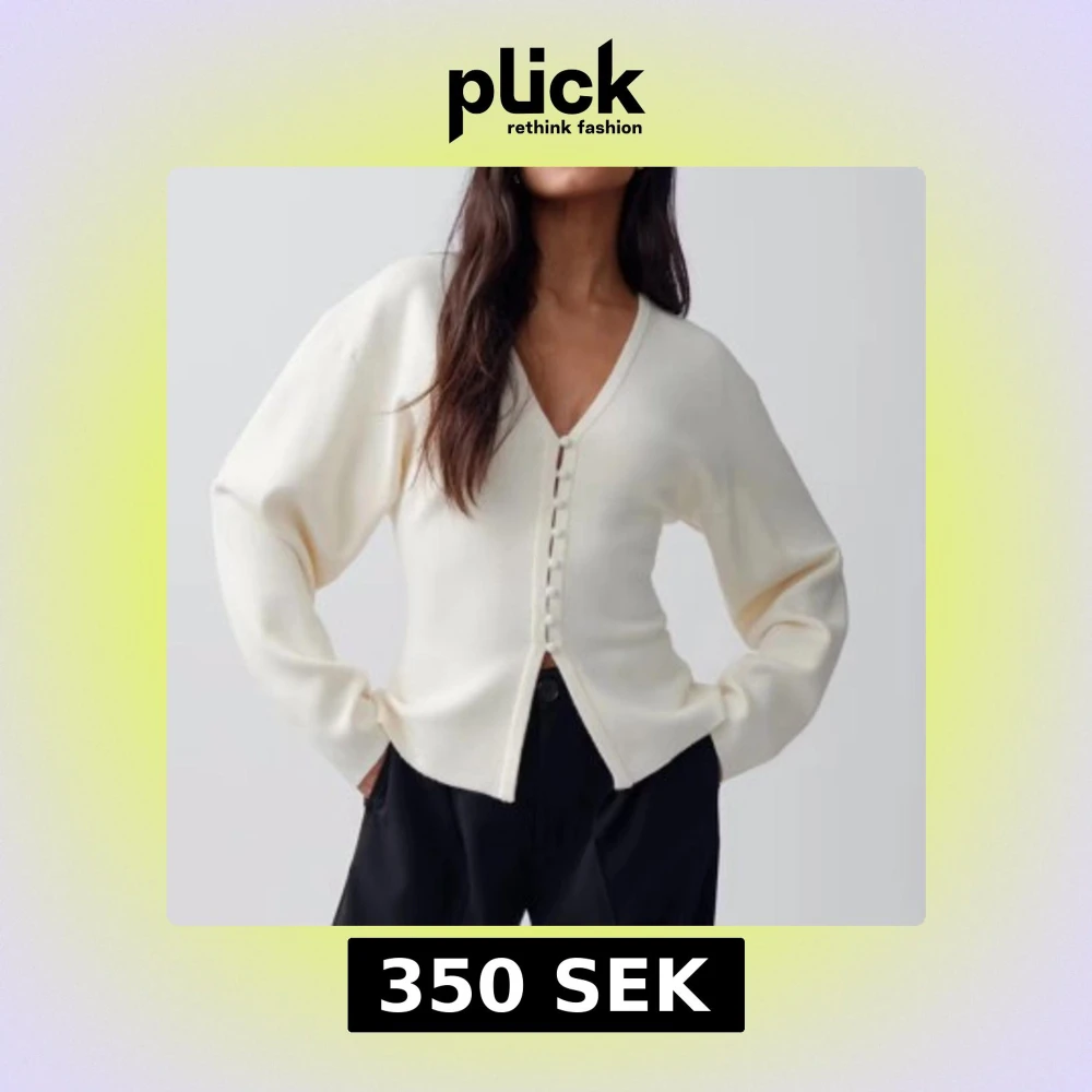 Säljer en stilren vit kofta med v-ringning och knappar framtill. Koftan har lång ärm och en avslappnad passform, perfekt att slänga på sig över en topp eller t-shirt. Enkel och snygg design som passar till mycket.
