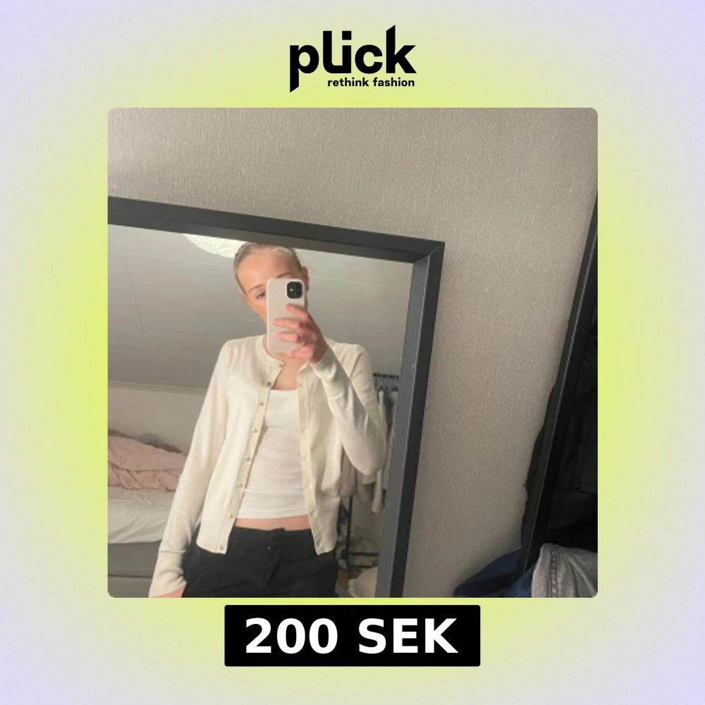 Säljer en stilren vit kofta med knappar framtill. Perfekt för lager-på-lager och passar till många olika outfits. Koftan har långa ärmar och en klassisk design.