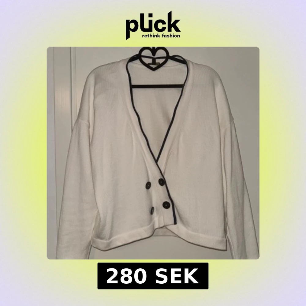 Säljer en stilren vit kofta med svarta knappar och kontrasterande mörkblå kanter. Koftan har en v-ringad design och långa ärmar, perfekt för en avslappnad look. Passar bra till både jeans och kjol. Perfekt för kyliga dagar!