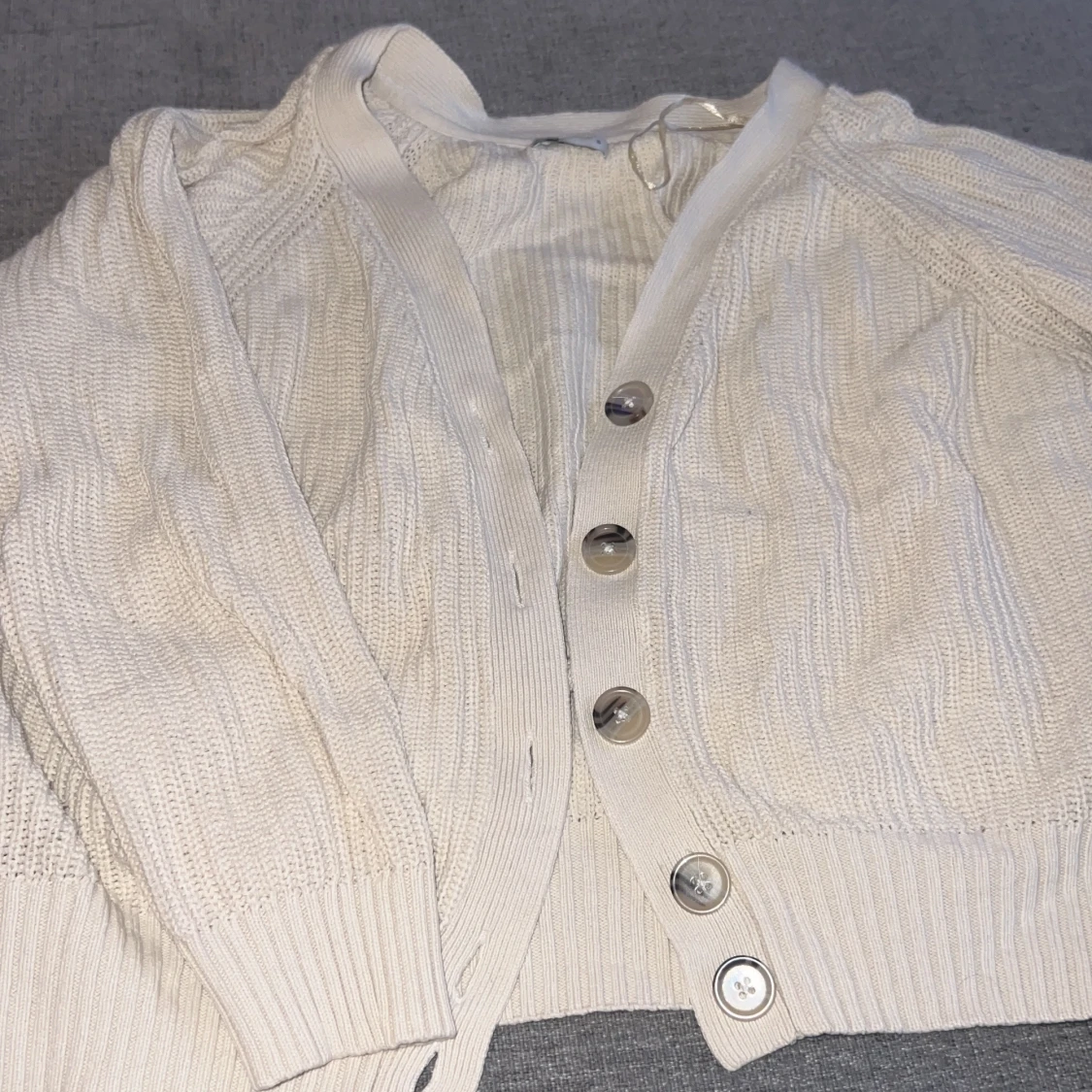 Säljer en stilren vit kofta med knappar framtill. Koftan har långa ärmar och ribbade detaljer vid ärmslut och nederkant. Perfekt för lager-på-lager under kyligare dagar.