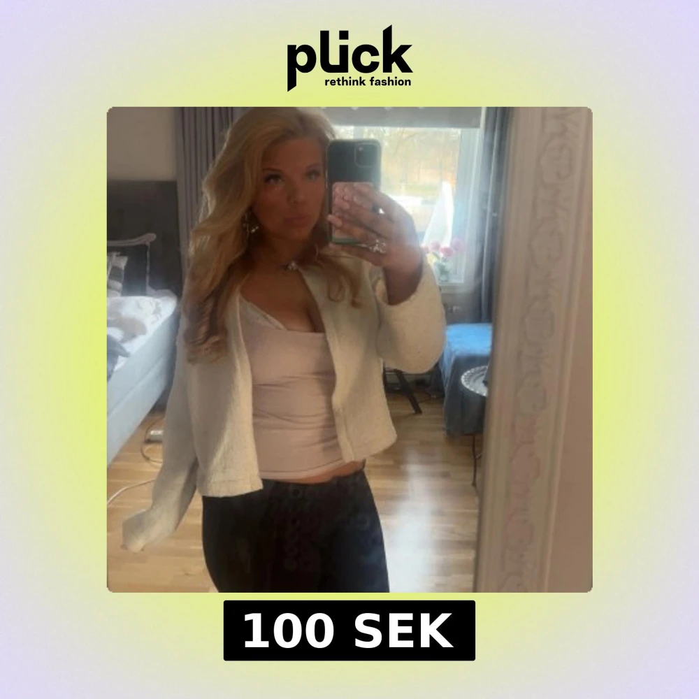 Säljer en vit, croppad kofta med lång ärm och öppen framtill. Den är i one size från märket missay jätte bekväm och fin