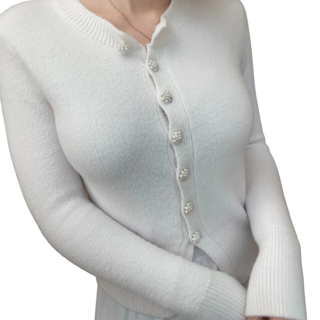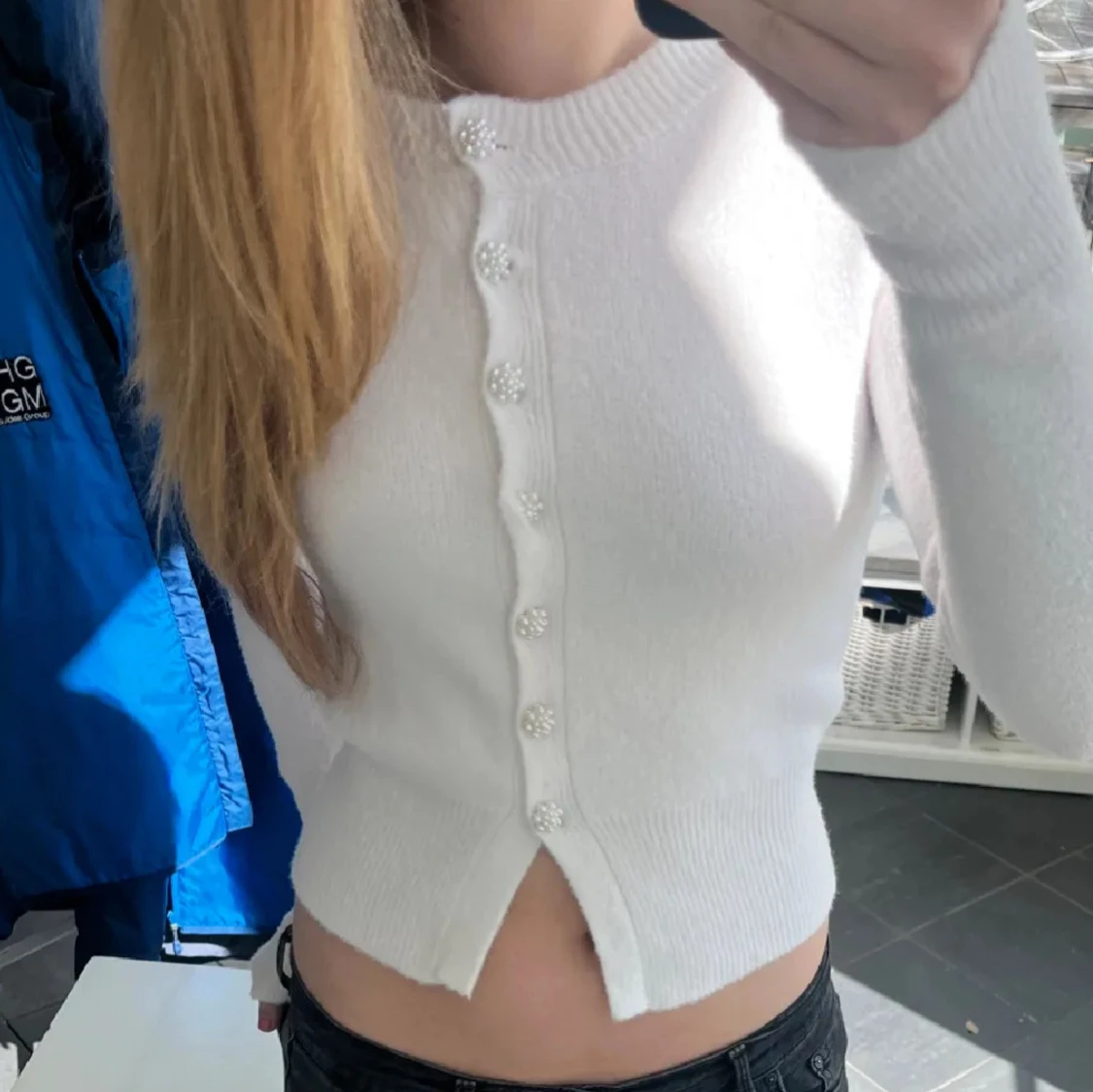 Supersöt vit kofta med långa ärmar. Så skönt och mjukt material, sticker inte! Superfina pärlknappar, perfekt för en clean, chic vibe till din outfit :)