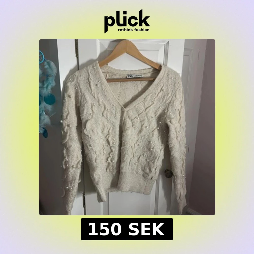 Superfin vit kofta från Zara med v-ringning och dekorativa pärlor över hela tröjan. Stickad i mjukt material med långärmad passform och ribbade muddar. Perfekt för dig som vill ha en mysig men ändå stylish look. Denna kofta säljer jag för den inte kommer till användning längre, använd den 5 gånger för 1 år sen ‼️Super fin och söt 🥰