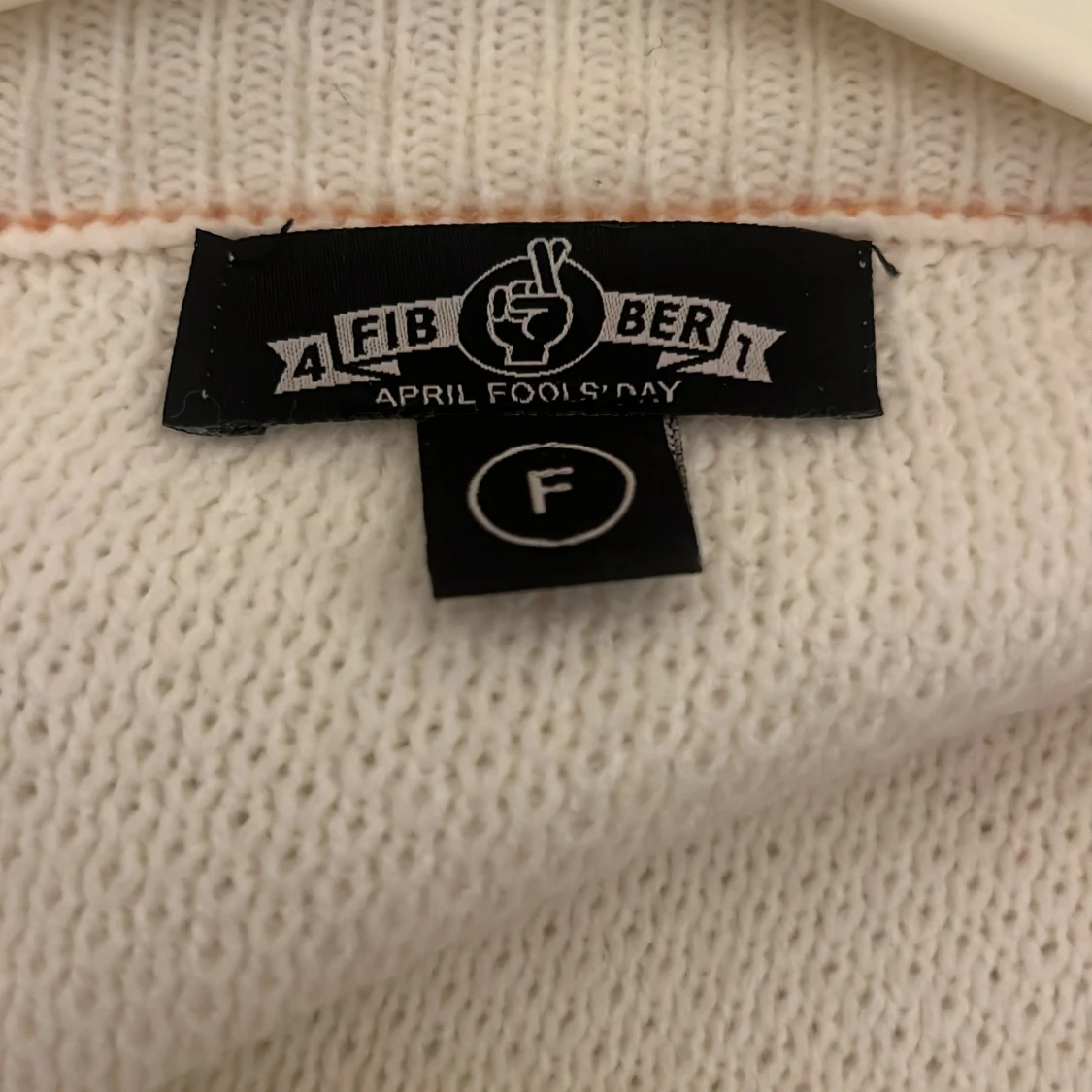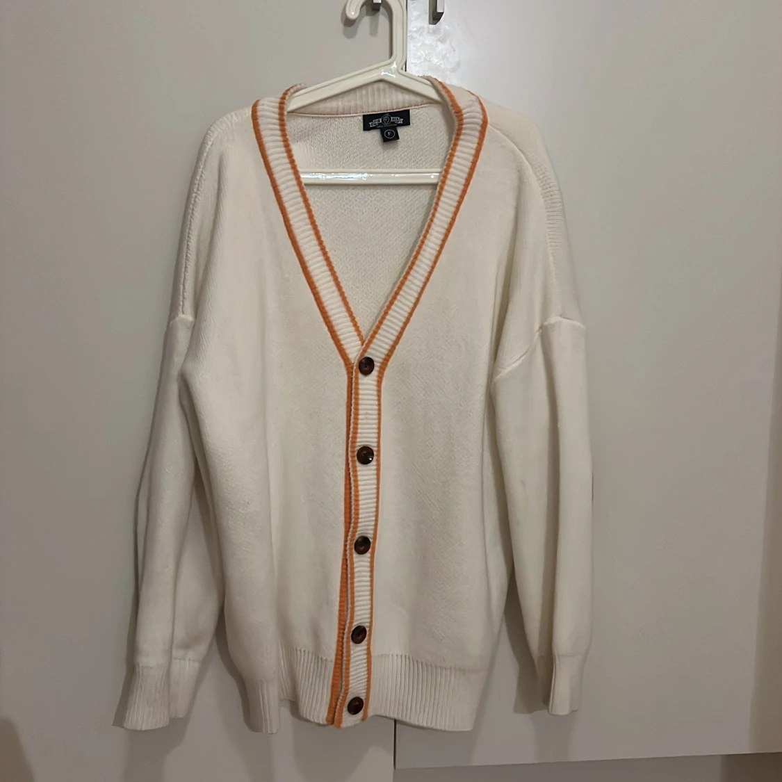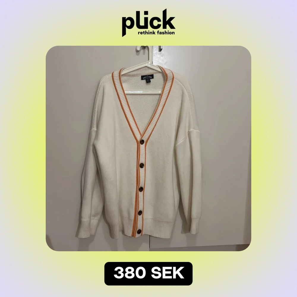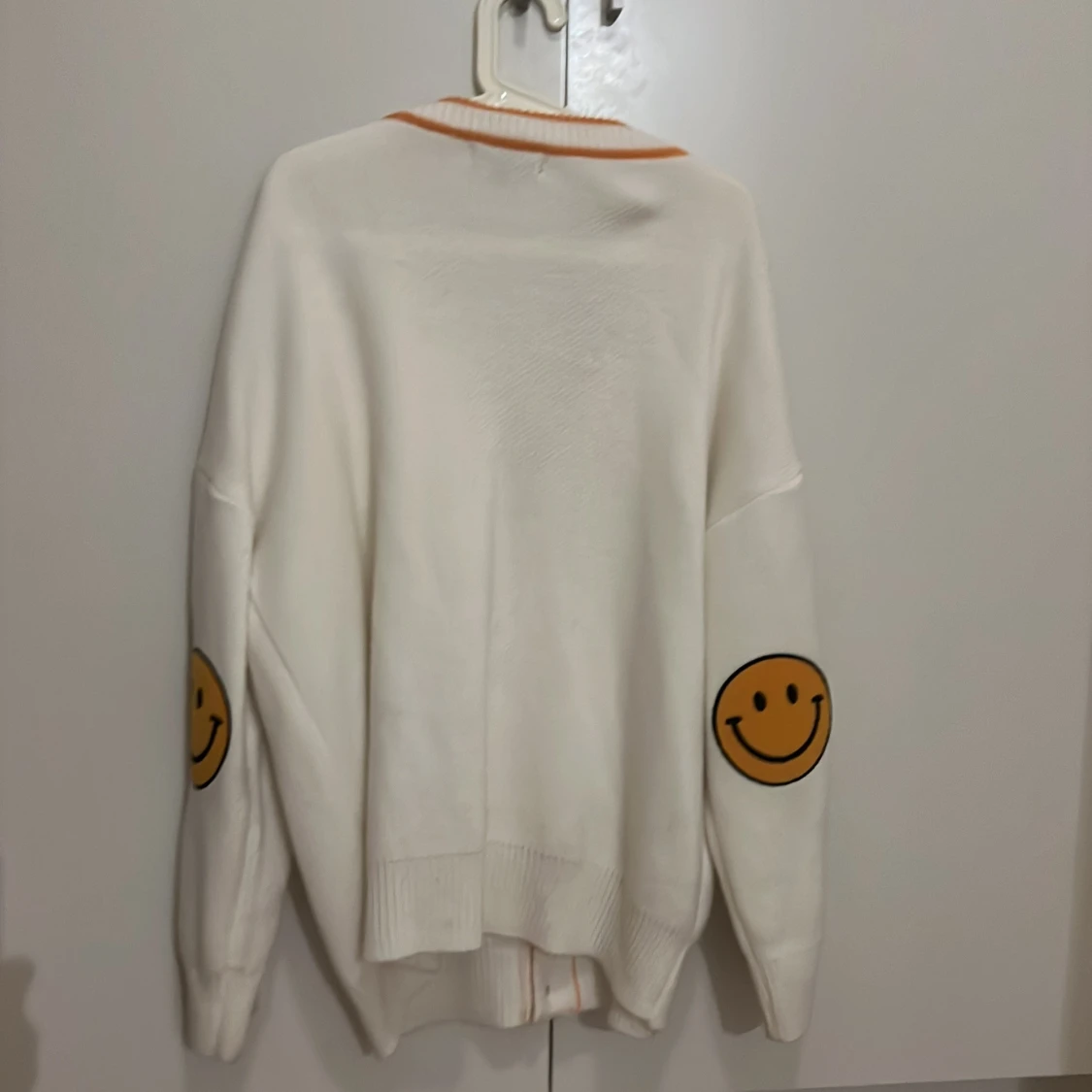 Köpt i Sydkorea, säljer en superfin vit kofta från 4FIBBER med orange kant och knappar. Den har coola smiley-detaljer på armbågarna som ger en rolig touch. Perfekt för både vardag och chillhäng.