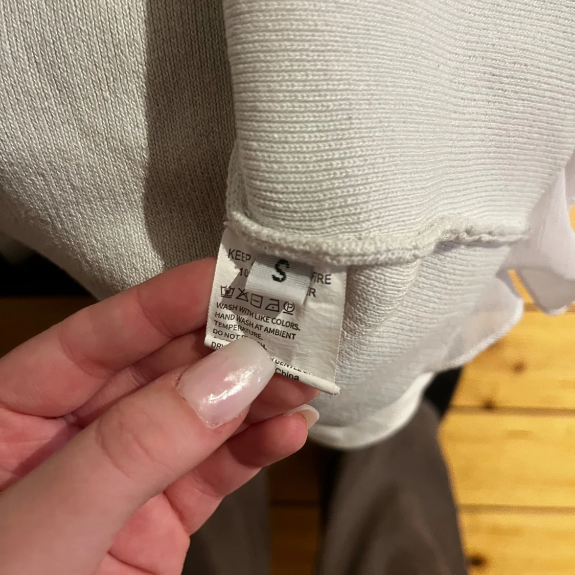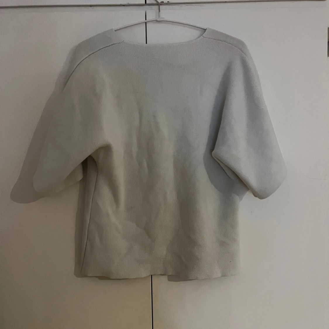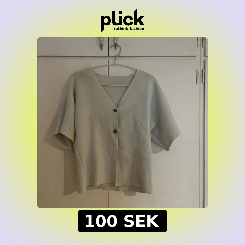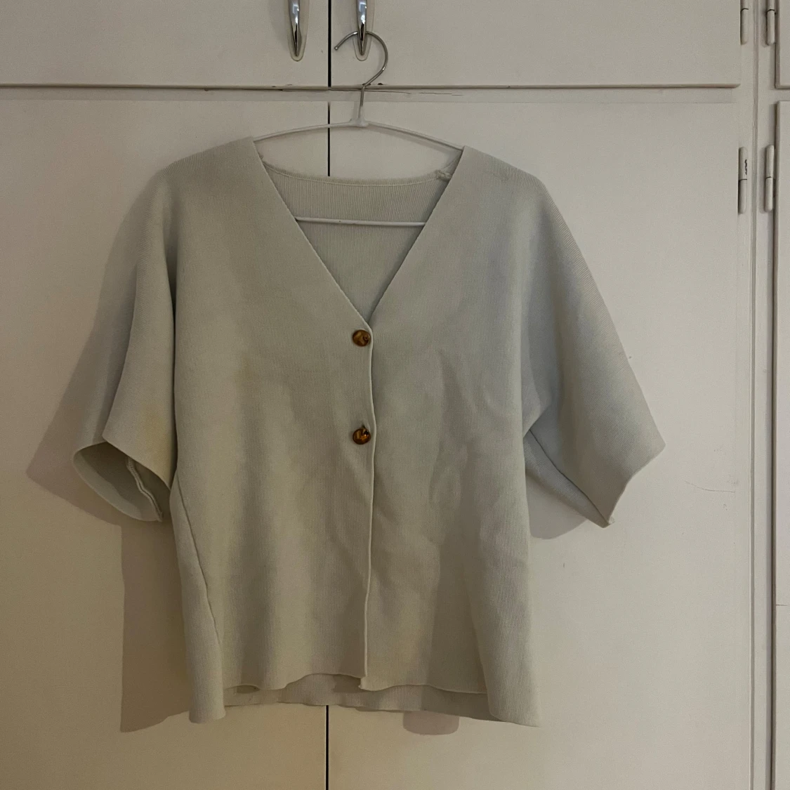 Snygg vit kofta med v-ringad hals och två bruna knappar framtill. Koftan har korta, vida ärmar och är tillverkad i ett mjukt stickat material som känns skönt mot huden. Perfekt för lager-på-lager och chill stil.