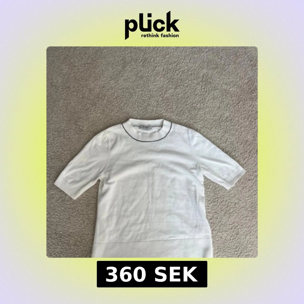 Säljer en stilren vit tröja från COS med korta ärmar och en subtil svart kant runt halsen. Perfekt för en minimalistisk look. Tröjan är i ett mjukt material som ger en bekväm passform.