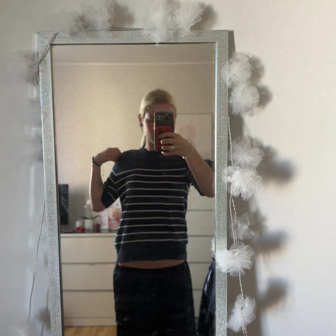 Svart tröja med vita horisontella ränder från lager 157. Tröjan har rund halsringning och trekvartsärm, vilket ger en avslappnad och trendig look. Perfekt för dig som gillar enkel men snygg stil. Tröjan är i superbra skick, bara använt 2 ggr tidigare.