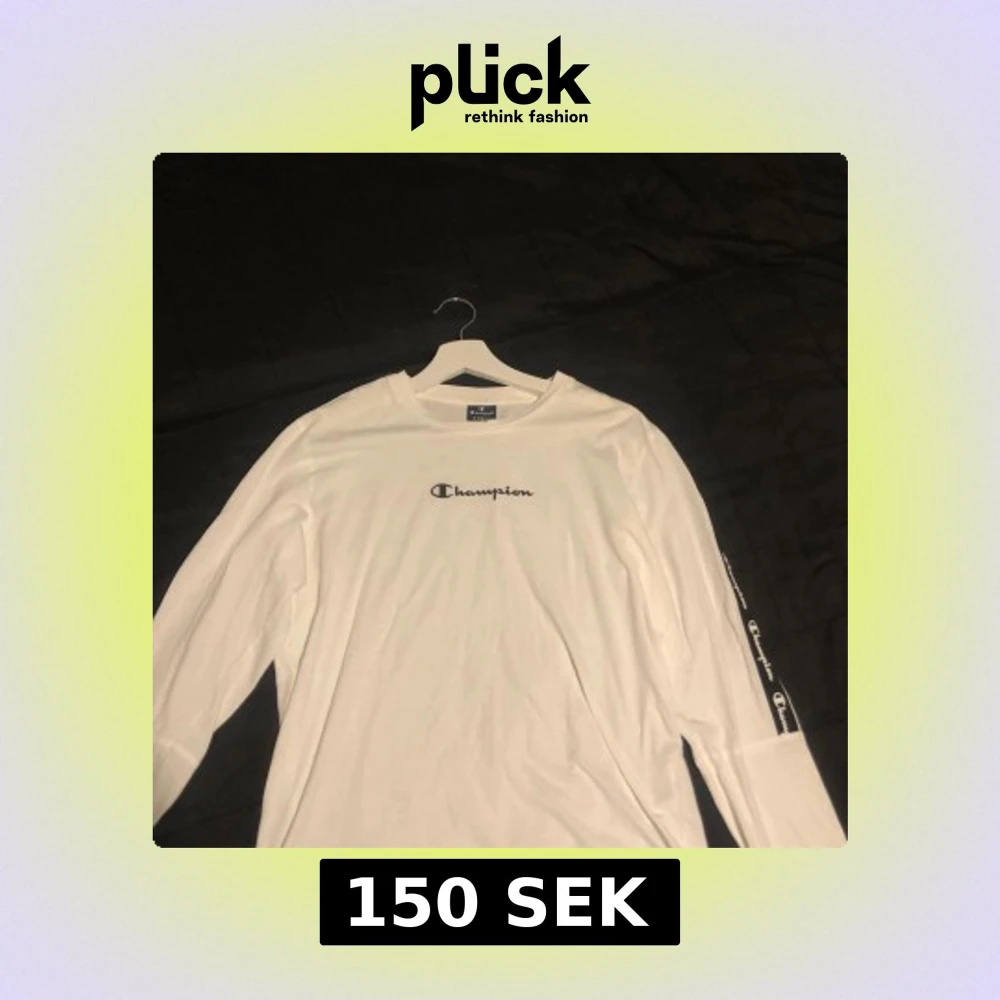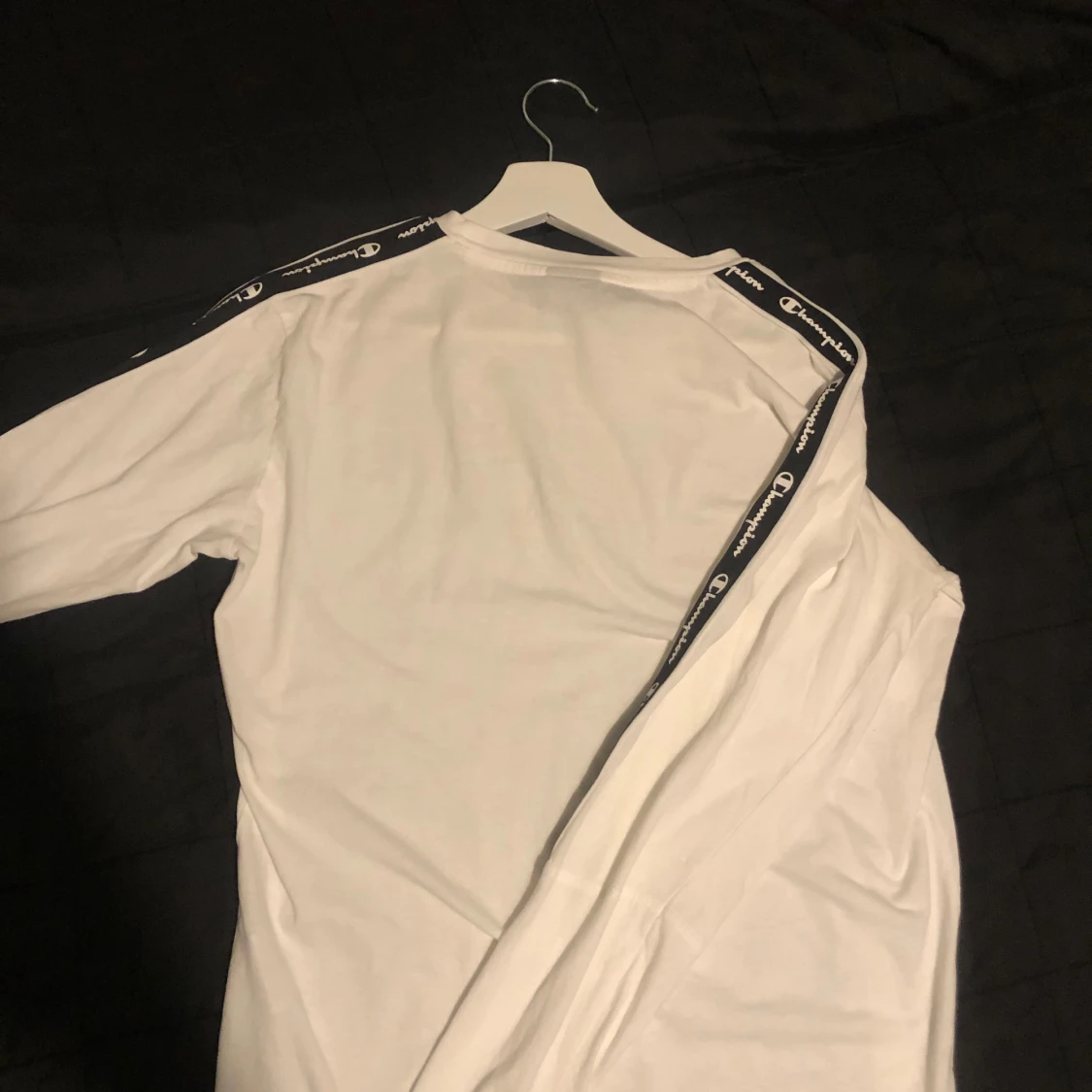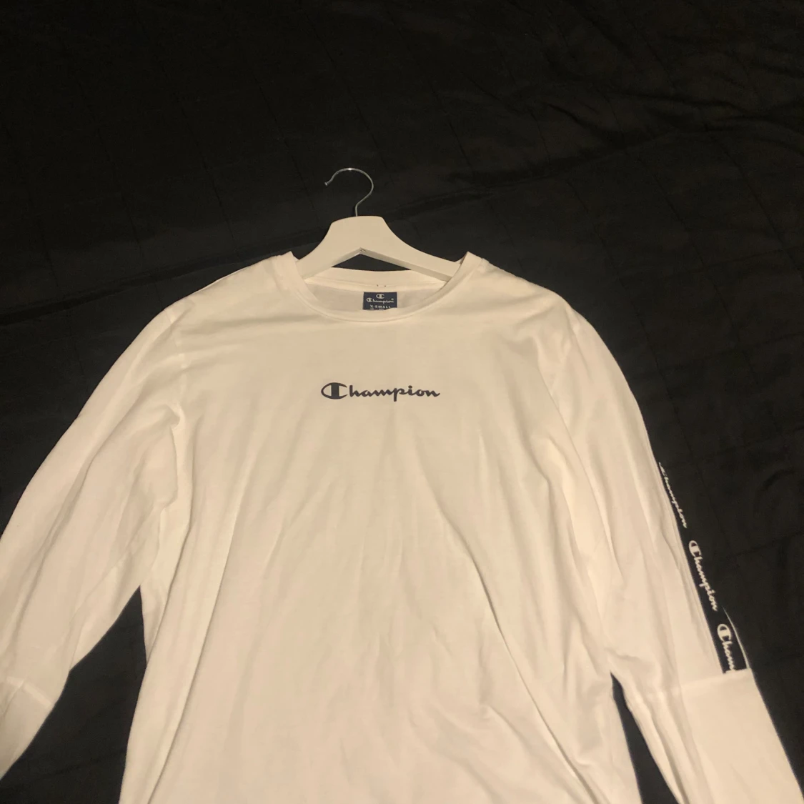 Säljer en vit långärmad tröja från Champion med svart logga på bröstet och Champion-tryck längs axlar och ärmar. Tröjan är oanvänd i stolen XS men passar även S.