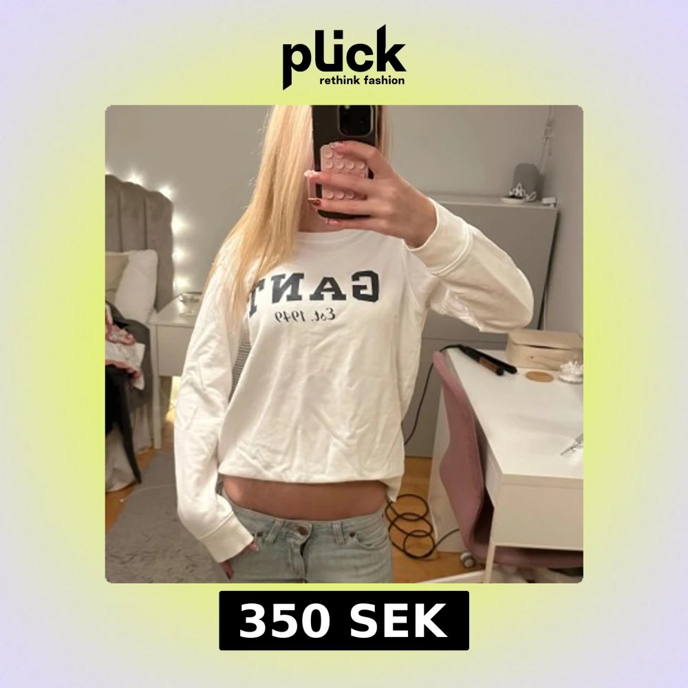 Vit sweatshirt från GANT med mörkblå tryckt logga och text 'Est. 1949' på bröstet. Tröjan har rund hals, långa ärmar och ribbade muddar vid ärmslut och nederkant. Tillverkad i mjuk bomull, perfekt för chill dagar.