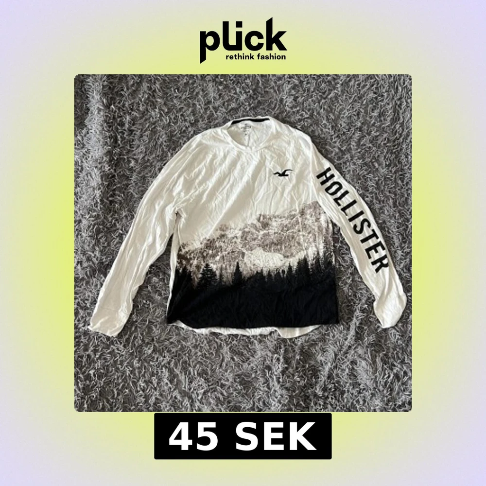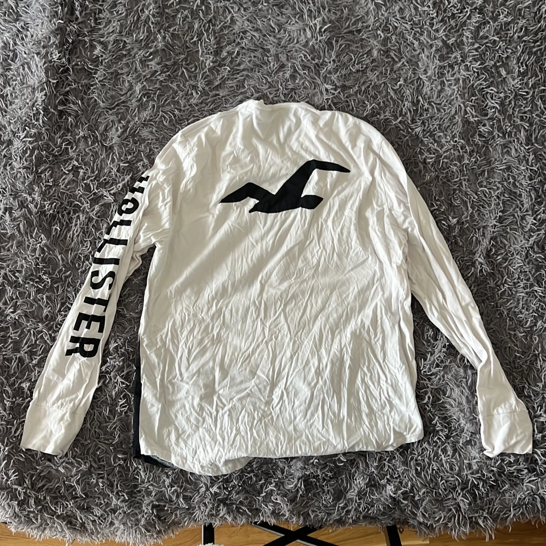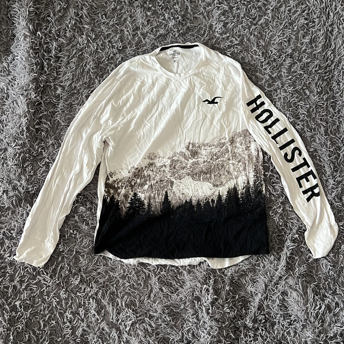 Snygg långärmad tröja från Hollister i vitt med svart print av berg och skog nertill. Stor logga på ärmen och fågeltryck på bröstet och ryggen. Tillverkad i 100% bomull, perfekt för dig som gillar streetstyle och tydliga tryck.