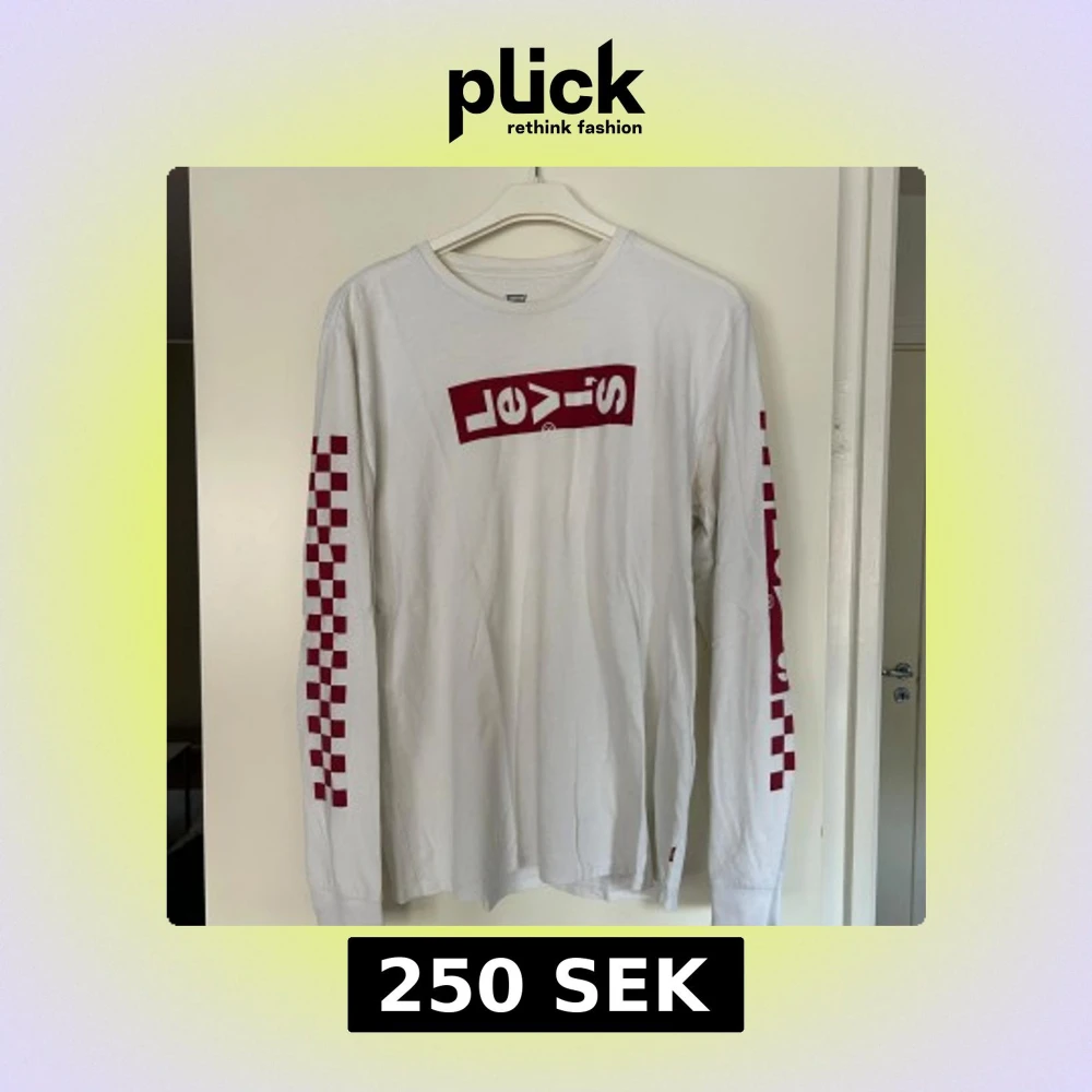 Vit långärmad tröja från Levi's med rött logotryck på bröstet och schackrutigt mönster längs ärmarna. Tröjan har en klassisk passform och är gjord i mjuk bomull, perfekt för en avslappnad streetstyle-look. Nypris 999kr