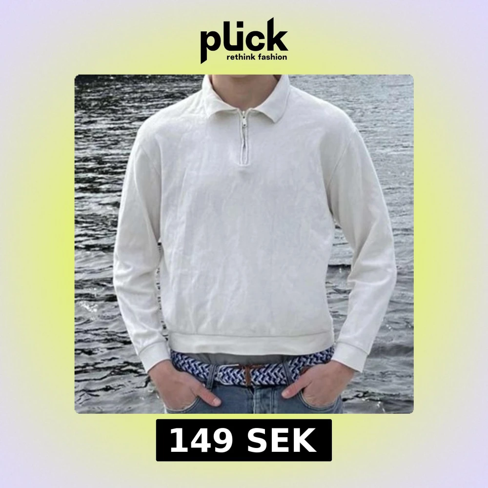 Säljer en stilren vit långärmad pikétröja med krage och dragkedja vid halsen. Perfekt för en clean och avslappnad look. Passar till jeans eller chinos.