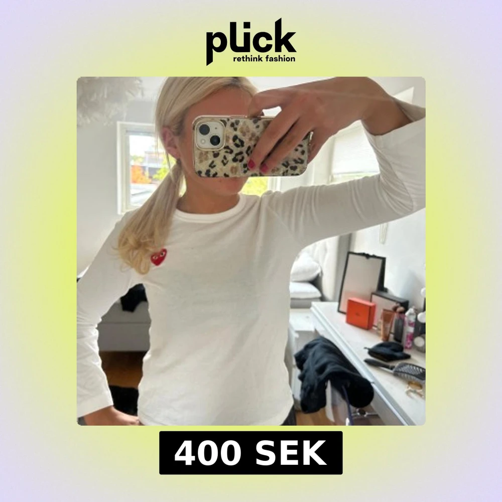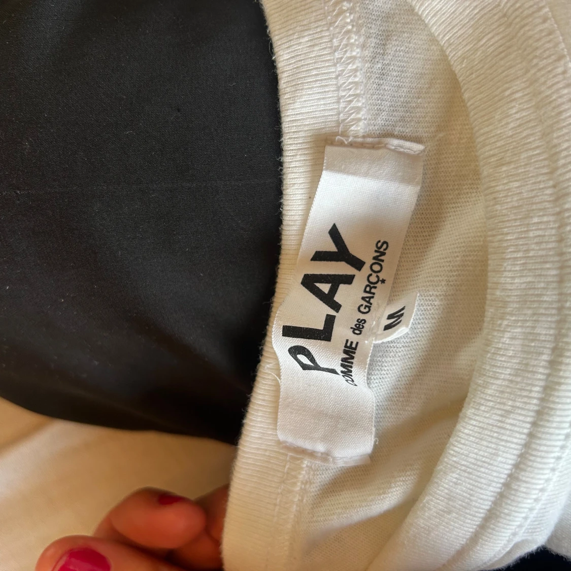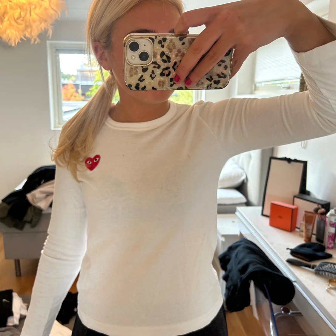 Säljer en vit långärmad tröja från Comme des Garçons PLAY tyvärr är den för liten kostar 1000kr på nk där ja köpte den
