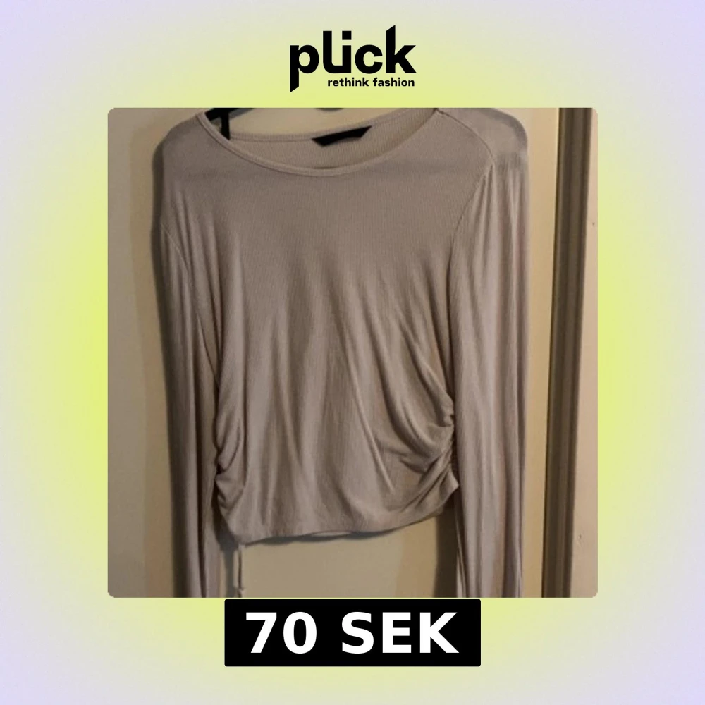 Säljer en vit ribbad långärmad topp med snörning i sidan. Croppad modell med lätt rynkade detaljer som ger en snygg passform. Står inte vilken storlek men skulle gissa S/M