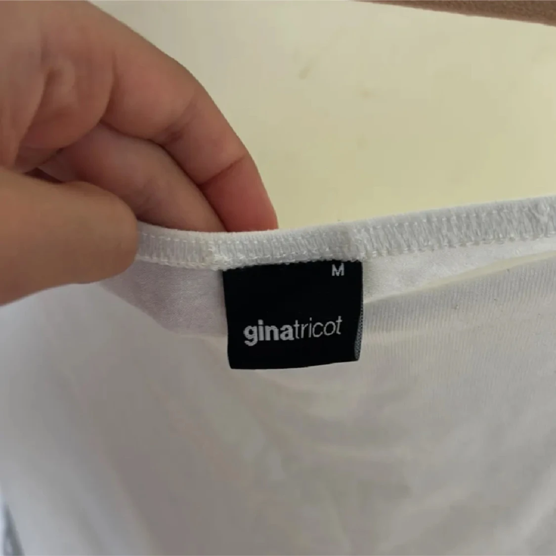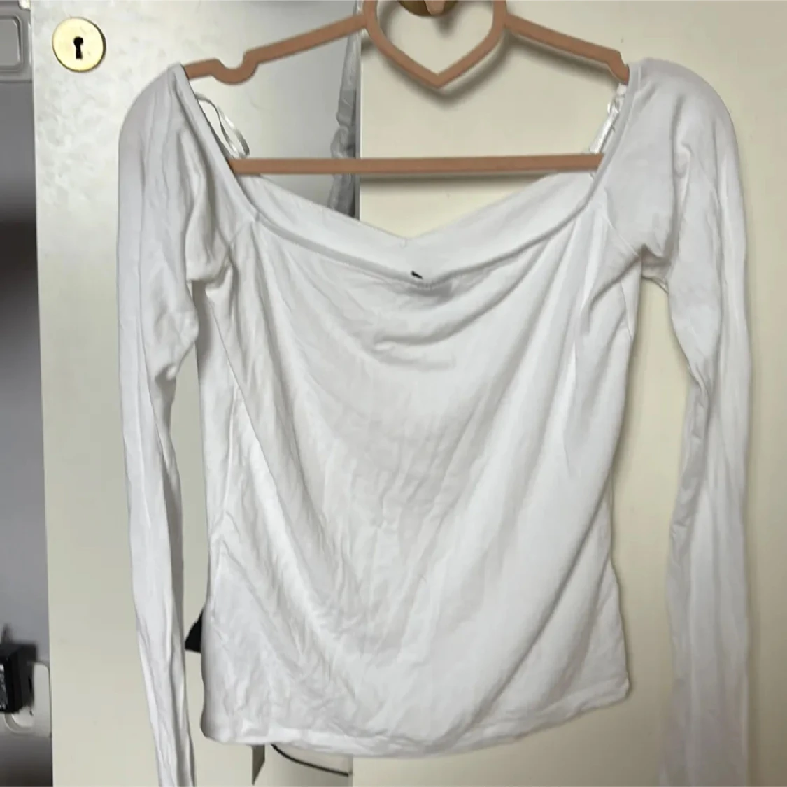 Säljer en vit långärmad topp från Gina Tricot i storlek M. Modellen har en snygg v-ringad hals och offshoulder-design som ger en cool vibe. Materialet är mjukt och stretchigt, troligen bomull. Perfekt att styla med jeans eller kjol för en fräsch look.