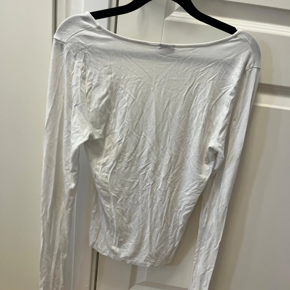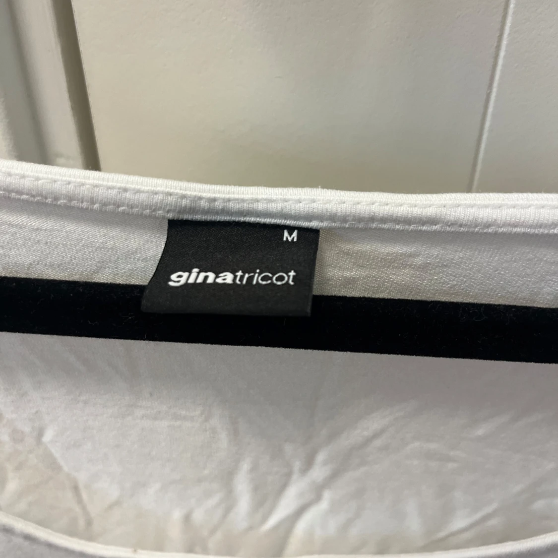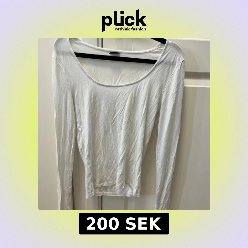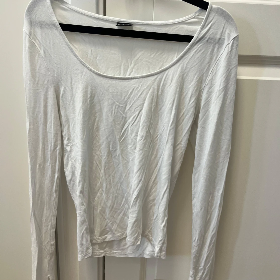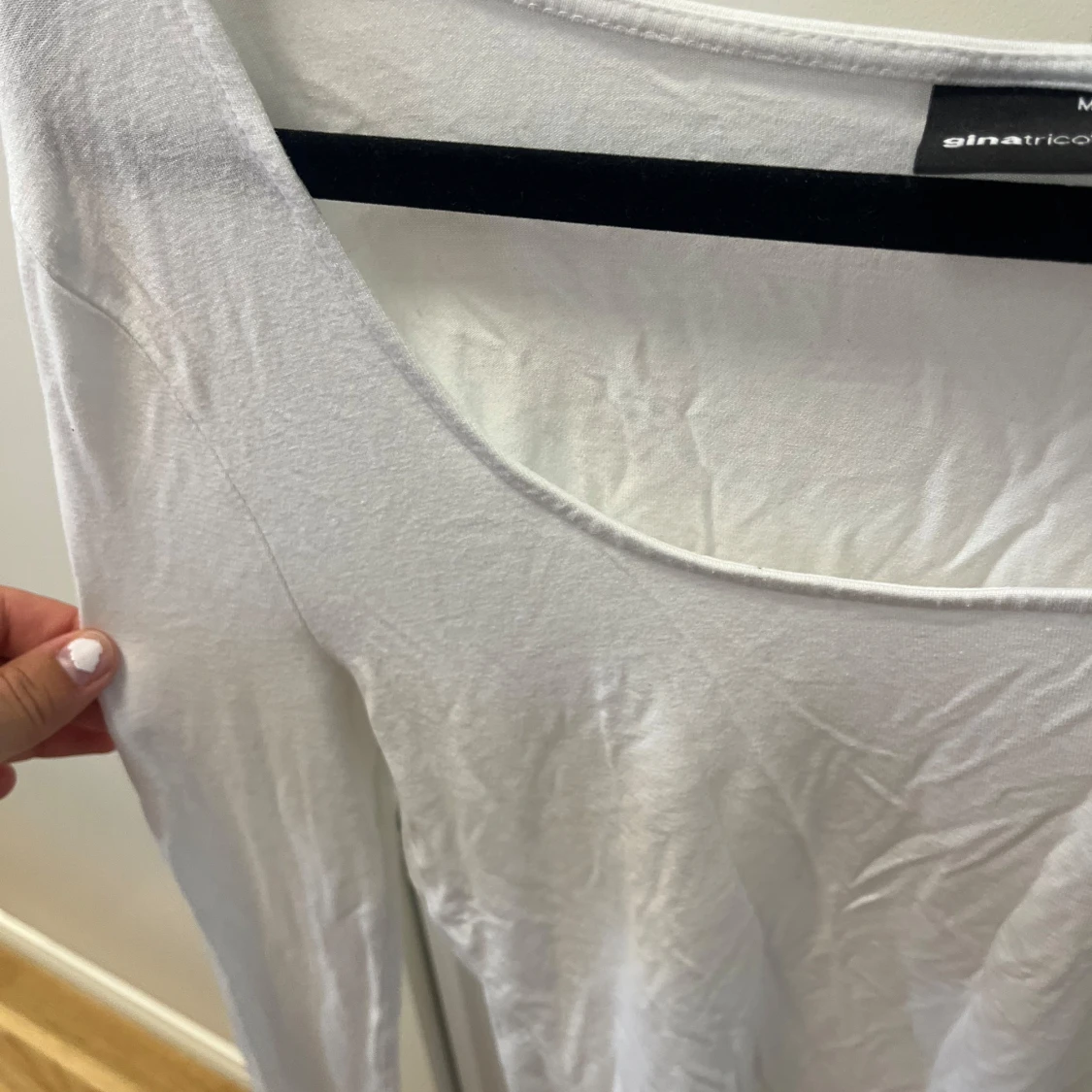 En basic vit långärmad topp från Gina Tricot i mjuk bomull. Modellen har en djup rundad urringning och sitter figurnära. Perfekt att styla med jeans eller kjol för en clean och enkel look.