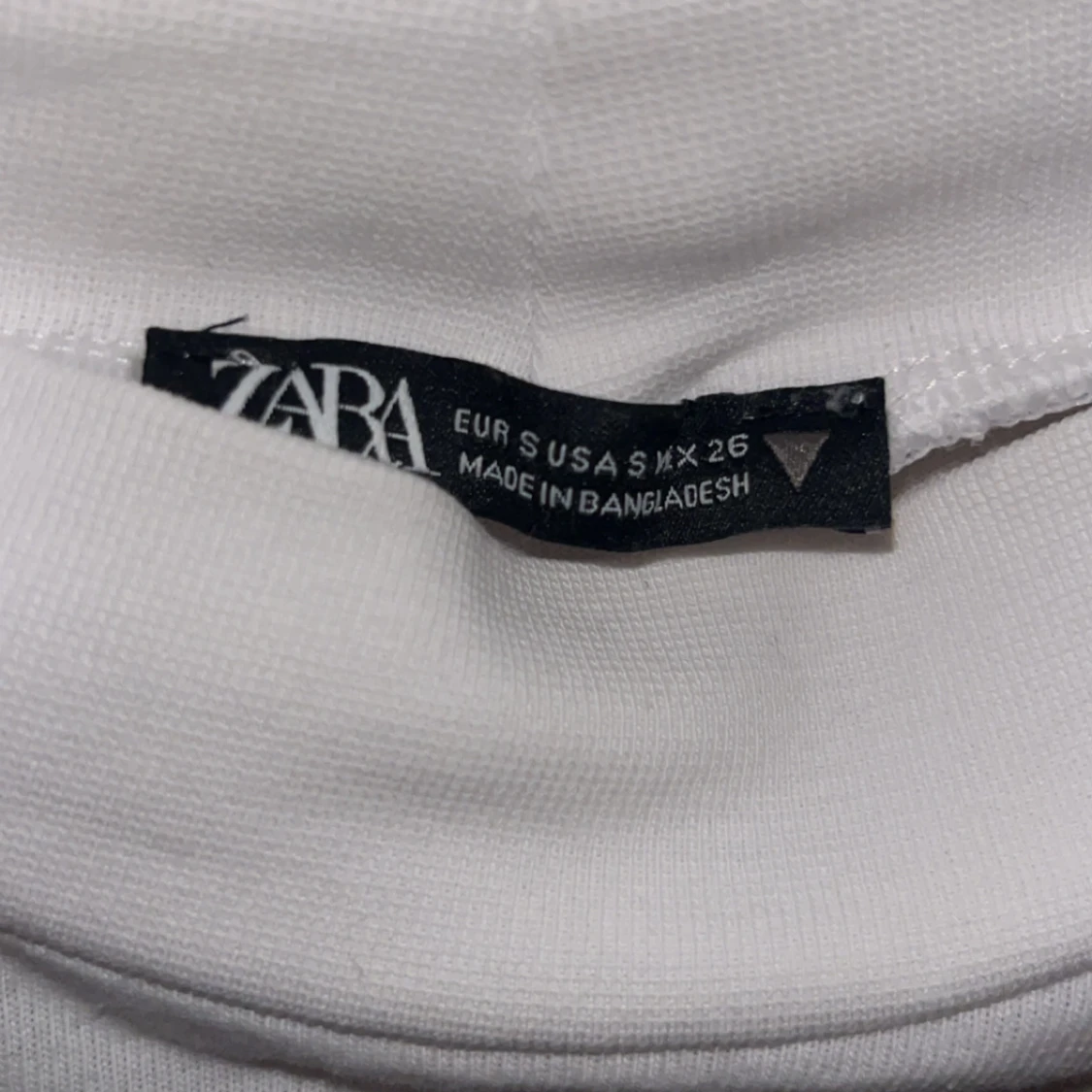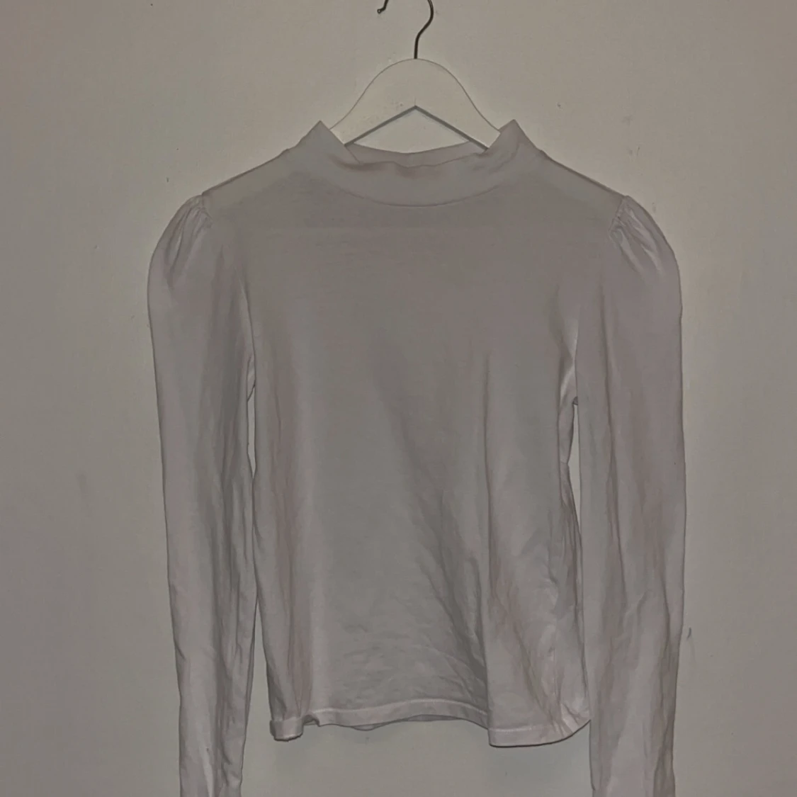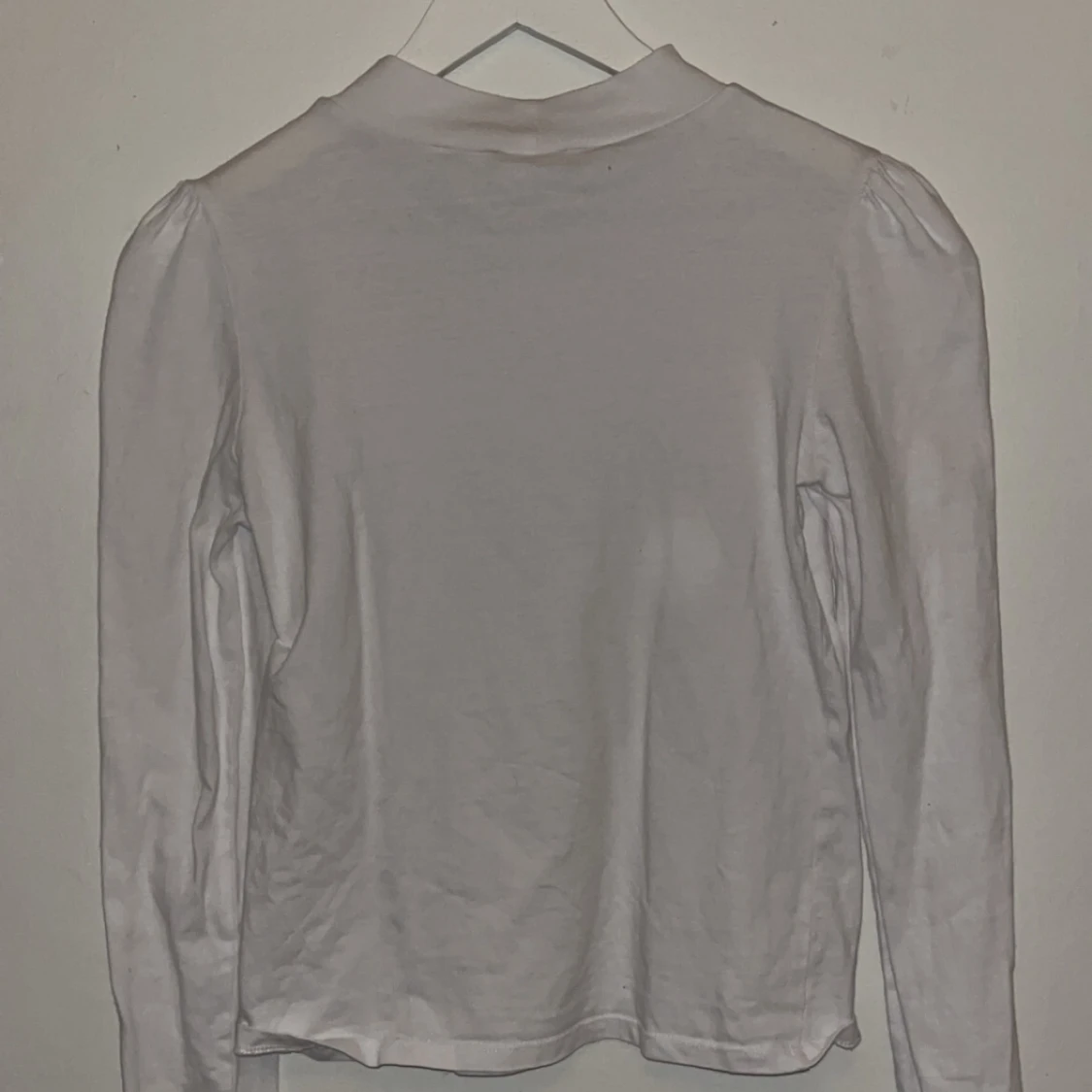 Säljer en stilren vit långärmad topp från Zara i storlek S. Toppen har lätt puffade axlar och en högre halsringning som ger en trendig look. Tillverkad i mjukt bomullsmaterial, perfekt för lager-på-lager eller som den är.